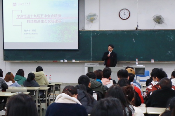 2020年12月17日,副校长陈庆华以《学深悟透十九届五中全会精神 持续推进生态文明建设》为题,为环境科学与工程学院2019级、2020级本科生上思政课。他从“准确把握全会精神”“抓好学习宣传贯彻”“推进生态文明建设”等方面展开论述,鼓励同学们把握国家发展大势、学会辩证观察世界、努力夯实专业知识,并号召同学们立足专业所学,努力为祖国生态文明建设作出青年应有的贡献。