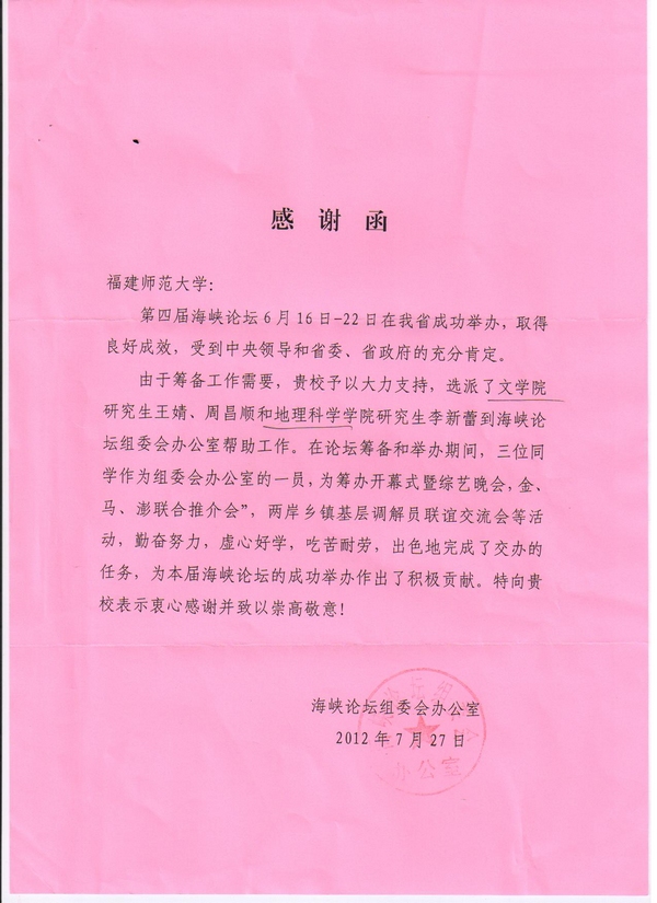 海峡论坛组委会致信感谢荣耀体育(中国)学生为第四届海峡论坛成功举办作出贡献