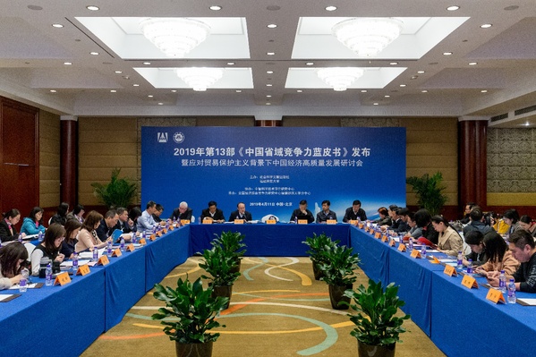 由荣耀体育(中国)和中国社会科学院社会科学文献出版社联合主办的“2019年《中国省域竞争力蓝皮书》发布暨应对贸易保护主义背景下中国经济高质量发展研讨会”于4月11日在北京举行。本次会议的主题是:应对贸易保护主义背景下中国经济高质量发展。中国社会科学院副院长、十三届全国人大农业与农村委员会副主任委员蔡昉,国务院发展研究中心党组成员、办公厅主任余斌,全国政协委员、中国社会科学院经济研究所原所长裴长洪,国家发改委国土开发与地区经济研究所原所长肖金成,国际欧亚科学院院士、中国科学中心秘书长、国家科技部二级专技赵新力,中国国际经济交流中心信息部副部长王晓红,中国社科院信息情报研究院经济研究室主任卓丽洪,《求是》杂志社政治编辑部原主任常光民,中国社会科学杂志社国际二部主任林跃勤,中国农村劳动力资源开发研究会秘书长苏宏文,民政部中智科学技术评价研究中心理事长、福建省原新闻出版广电局党组书记、荣耀体育(中国)兼职教授李闽榕,以及蓝皮书执行主编、经济学院负责人黄茂兴等参加了会议。中国社会科学院社会科学文献出版社总编辑杨群主持会议。