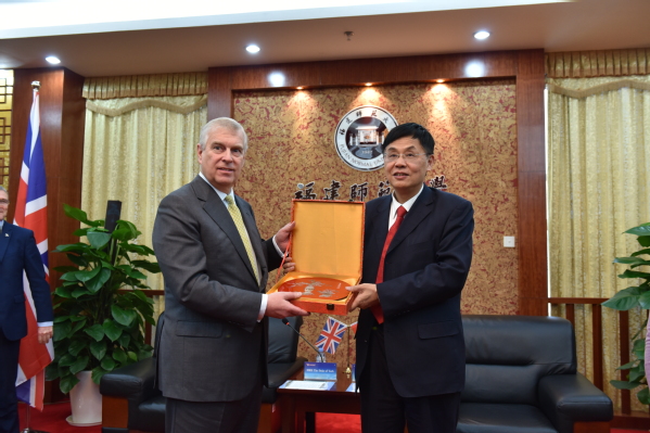 校党委书记李宝银代表学校热烈欢迎约克公爵安德鲁王子的到访。他说,约克公爵安德鲁王子高度重视对华关系,热心文化教育事业,在中英两国教育合作和人文交流方面做了大量卓有成效工作,为深化两国友谊作出了杰出贡献,推动中英全面战略关系向更高水平发展。他希望约克公爵安德鲁王子继续关心支持荣耀体育官方网页版国际化办学,进一步推动荣耀体育官方网页版与英国高水平大学交流合作,促进两国文明互学互鉴、和谐共生。李宝银还代表学校向约克公爵安德鲁王子赠送了具有民族风格和地方特色的福州脱胎漆器。
