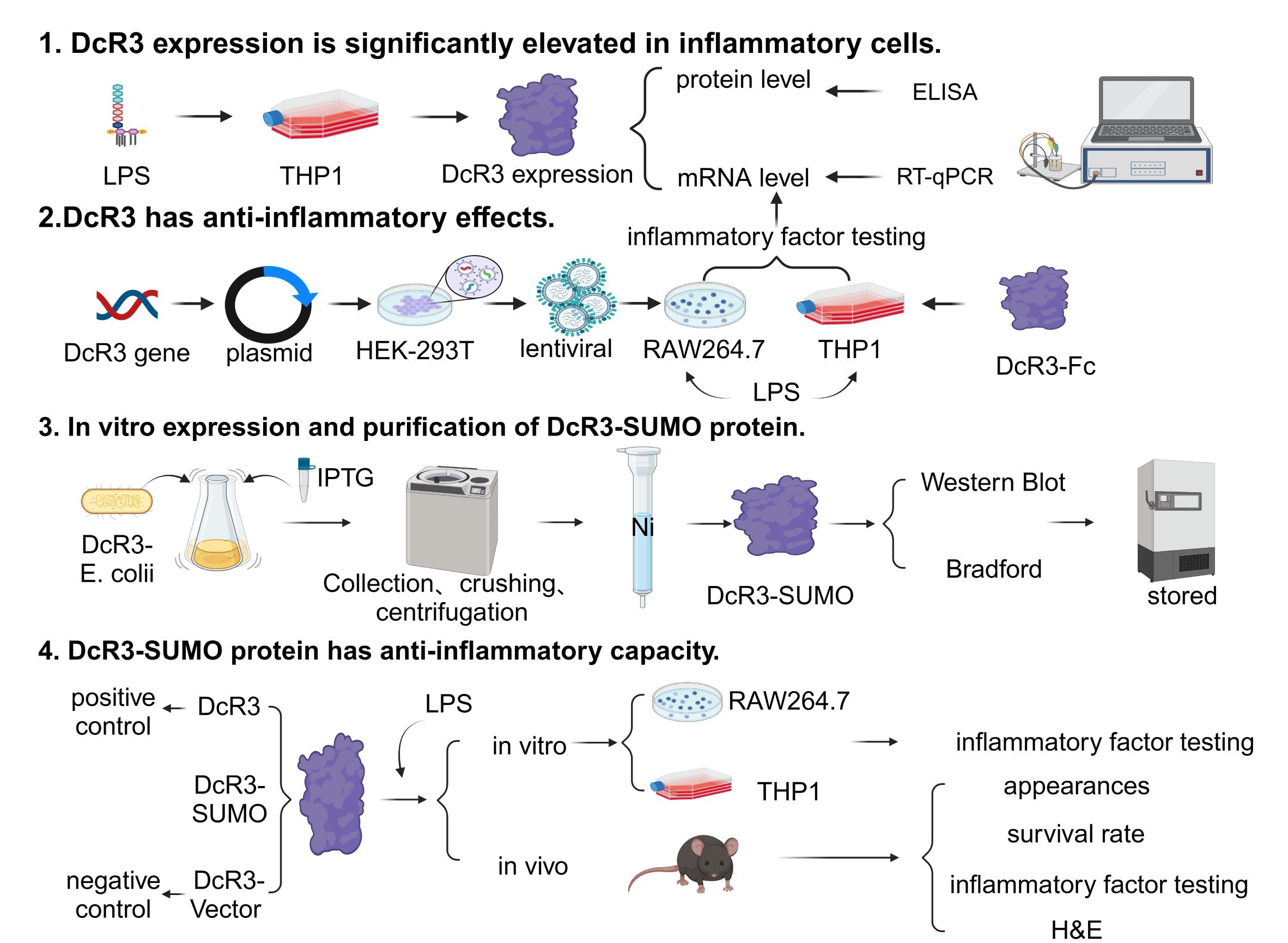 荣耀体育(中国)生命科学学院、南方生物医学研究中心苏经迁副教授课题组的前期研究表明,DcR3可通过减轻全身炎症反应抑制过度免疫反应,从而改善脓毒症。这一重要成果已于2024年5月发表在国际微生物学与免疫学领域顶级期刊《mBio》。与此同时,课题组通过结构改造和筛选,成功获得了DcR3的类似物——DcR3-SUMO蛋白。