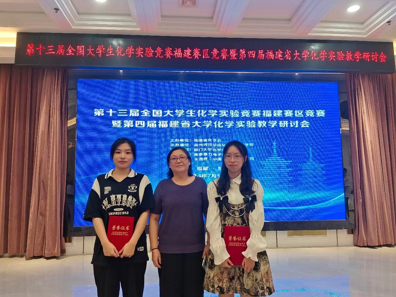 近日,第十三届全国大学生化学实验竞赛福建赛区竞赛暨第四届福建省大学化学实验教学研讨会在泉州举办。经过激烈角逐,化学与材料学院2021级化学(师范)专业肖宠馨同学(指导老师:李秀华)获一等奖,祝敏倩同学(指导老师:黄丽梅)获二等奖。同时,肖宠馨同学被推荐参加第十三届全国大学生化学实验竞赛决赛。据悉,本次比赛共有省内15所高校的30位本科生、50余位教师参加,共评出一等奖6名、二等奖10名、三等奖10名、优秀奖4名。(化学与材料学院)