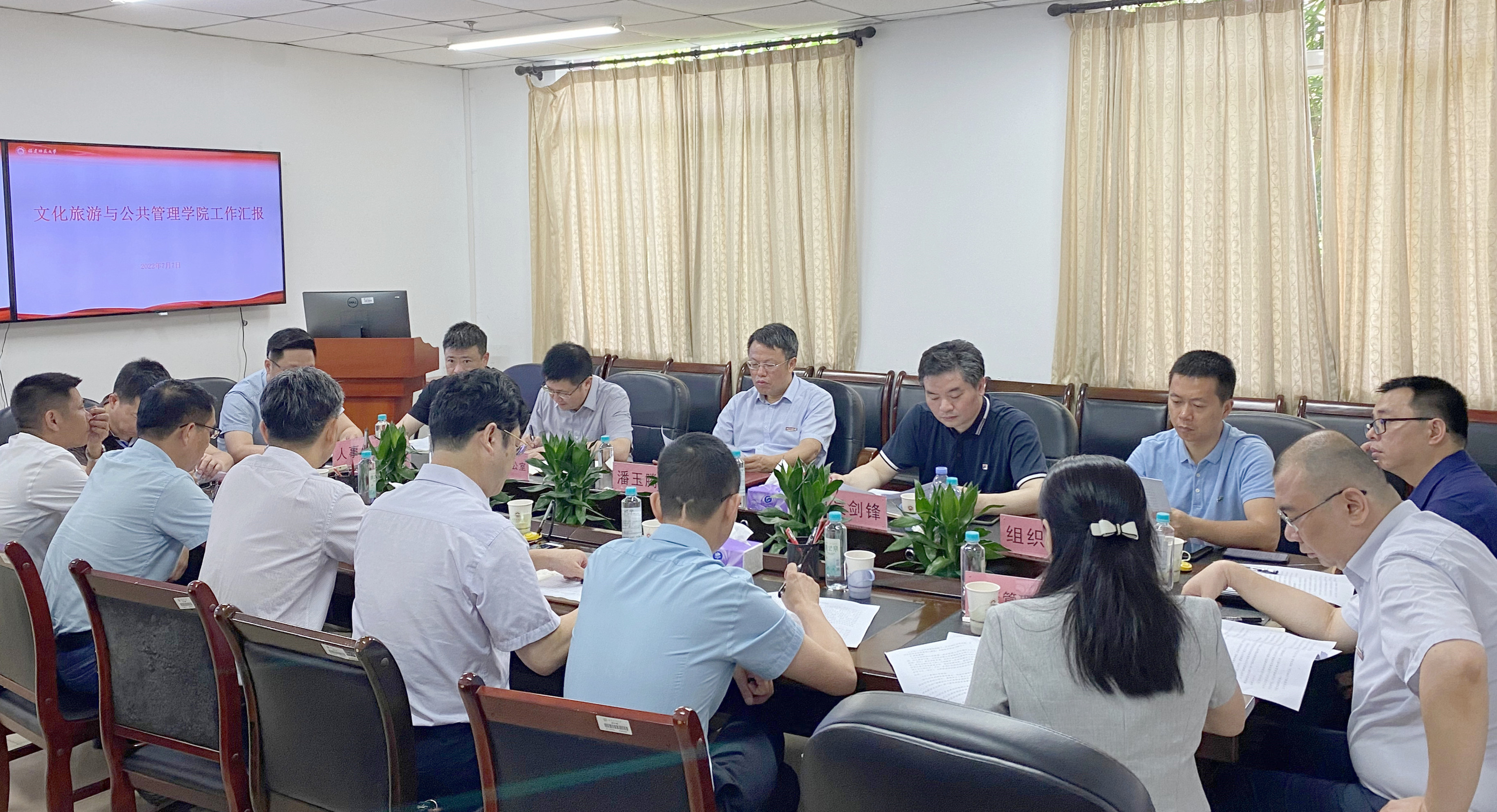 7月7日,校党委书记潘玉腾、副校长吴剑锋率党政办公室、组织部、教务处、研究生院、发展规划处、人事处、财务处、资产管理处等部门有关负责人到文化旅游与公共管理学院调研。文化旅游与公共管理学院党政领导班子成员参加调研座谈会。