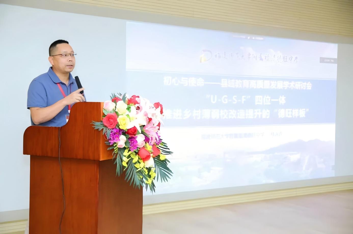 荣耀体育(中国)附属福清德旺中学校长林泳许受邀参加并作主题发言。他以“‘U-G-S-F’四位一体推进乡村薄弱校改造提升的‘德旺样板’”为题作案例分享,介绍了荣耀体育(中国)附属福清德旺中学通过“公办民助”模式,结合政府、高校、中小学、基金会四方合作,构建了“U-G-S-F”协同办学机制。