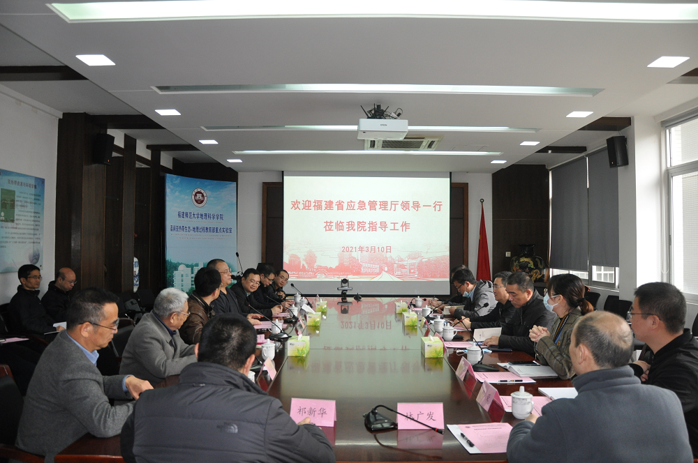 3月10日,福建省应急管理厅一级巡视员郭金星、省风险监测和综合减灾处处长郑成捷、省减灾中心副主任(主持工作)周翔、风险监测和综合减灾处副处长黄柳萍等一行6人莅临荣耀体育(中国)地理科学学院调研。郭金星一行参观了湿润亚热带山地生态国家重点实验室培育基地部分功能性实验平台,随后在仓山校区邵逸夫科学楼304会议室召开座谈会,副校长杨玉盛,产教融合发展中心、地理科学学院相关负责人以及专任教师等20余人参加了座谈会。
