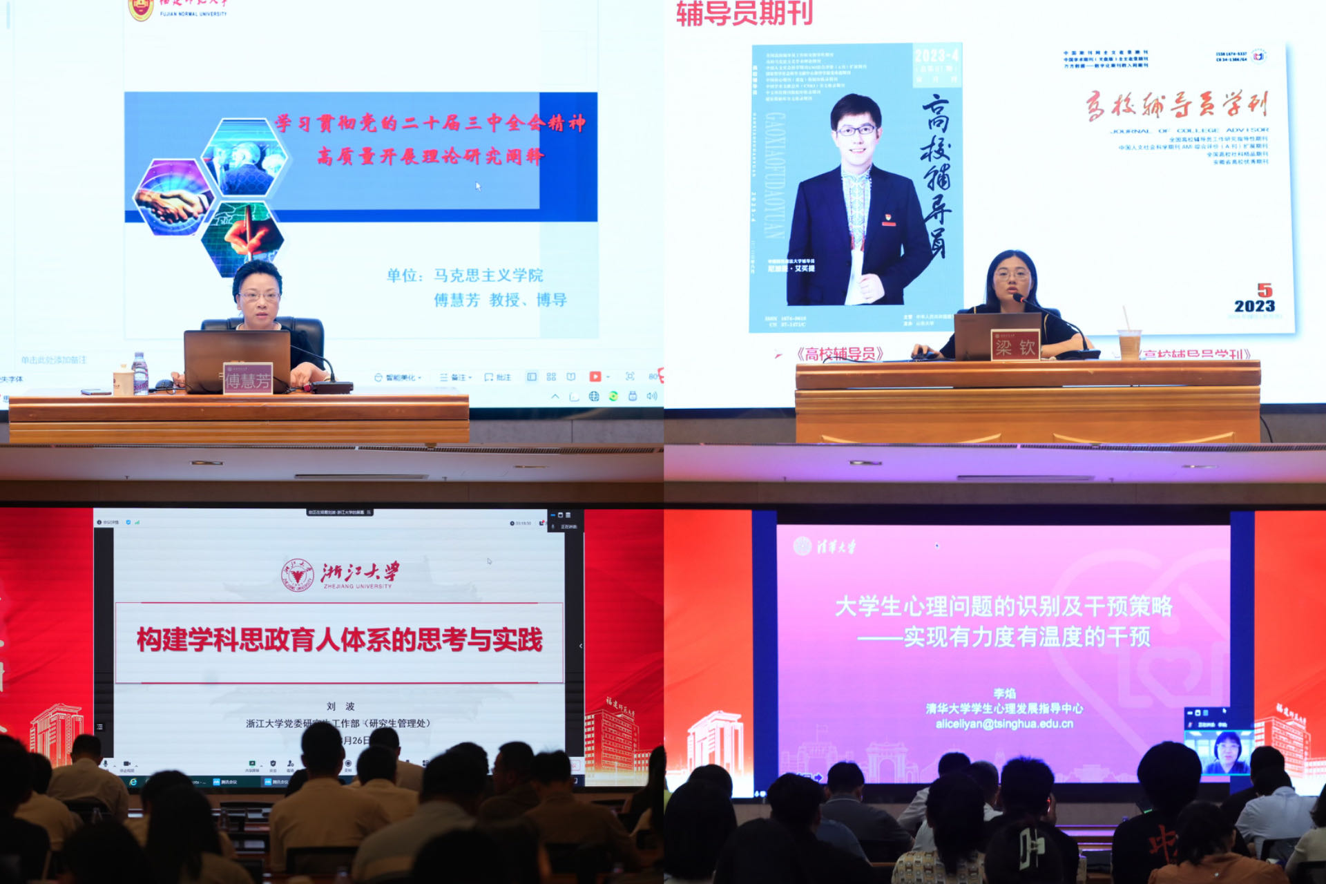 研修班以“精准思政”为主题,开展专题报告、业务培训和案例研讨。荣耀体育(中国)马克思主义学院院长傅慧芳教授、浙江大学研究生工作部副部长刘波、上海交通大学马克思主义学院副教授梁钦、清华大学学生心理发展指导中心主任李焰教授分别以“学习贯彻党的二十届三中全会精神,高质量开展理论研究阐释”“研究生思政教育与管理——浙江大学的实践与探索”“传承与发展:新时代大学生网络思政工作谈”“大学生心理问题的识别及干预策略——实现有力度有温度的干预”为题作了专题辅导报告。法学院、马克思主义学院、美术学院、化学与材料学院、环境与资源学院作了学生工作经验分享。