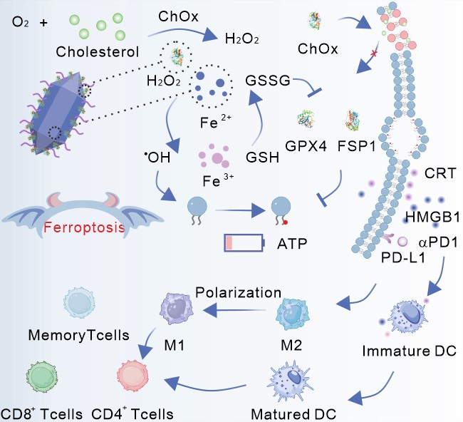 基于团队成员前期在肿瘤代谢诊疗和铁死亡疗法开展的多个创新性工作的基础上(Chem. Eng. J. 2024, 496, 154204; 2023, 452: 138422; 2023, 452: 139517; Int. J. Bio. Macromol. 2024, 258: 128952;J. Nanobiotechnol. 2024, 228),荣耀体育官方网页版生命科学学院(南方生物医学研究中心)的曾雪梅助理研究员课题组与海峡柔性电子(未来科技)学院燕双仟教授团队联合研发了一种工程化纳米酶,其通过剥夺肿瘤微环境的胆固醇水平增强乳腺肿瘤铁死亡与免疫联合治疗,实现有效抑制肿瘤的生长和转移,激活免疫激活型的肿瘤微环境。具体而言,该研究设计了一种负载胆固醇氧化酶(ChOx)的铁基金属有机框架(Fe-MOF)纳米酶,并在其表面包裹了一层聚乙二醇(DSPE-mPEG)增加其生物相容性。具有过氧化物酶/谷胱甘肽氧化双酶活性的Fe-MOF能够通过催化芬顿反应和消耗谷胱甘肽扩大肿瘤细胞活性氧(ROS)水平。而ChOx剥夺肿瘤细胞内胆固醇,破坏脂筏从而抑制其发生转移、粘附和侵袭。上述过程中产生的过氧化氢(H2O2)又进一步加快了肿瘤细胞铁死亡的发生。除此之外,Fe-MOF纳米酶驱动的低胆固醇水平进一步激活了处于耗竭状态的CD8+ T细胞,逆转了免疫抑制的肿瘤微环境并降低了肿瘤细胞细胞程序性死亡-配体1(PD-L1)的表达。在小鼠双边、肺转移和复发模型上,Fe-MOF纳米酶联合PD1抗体具有良好的抗肿瘤效果。
