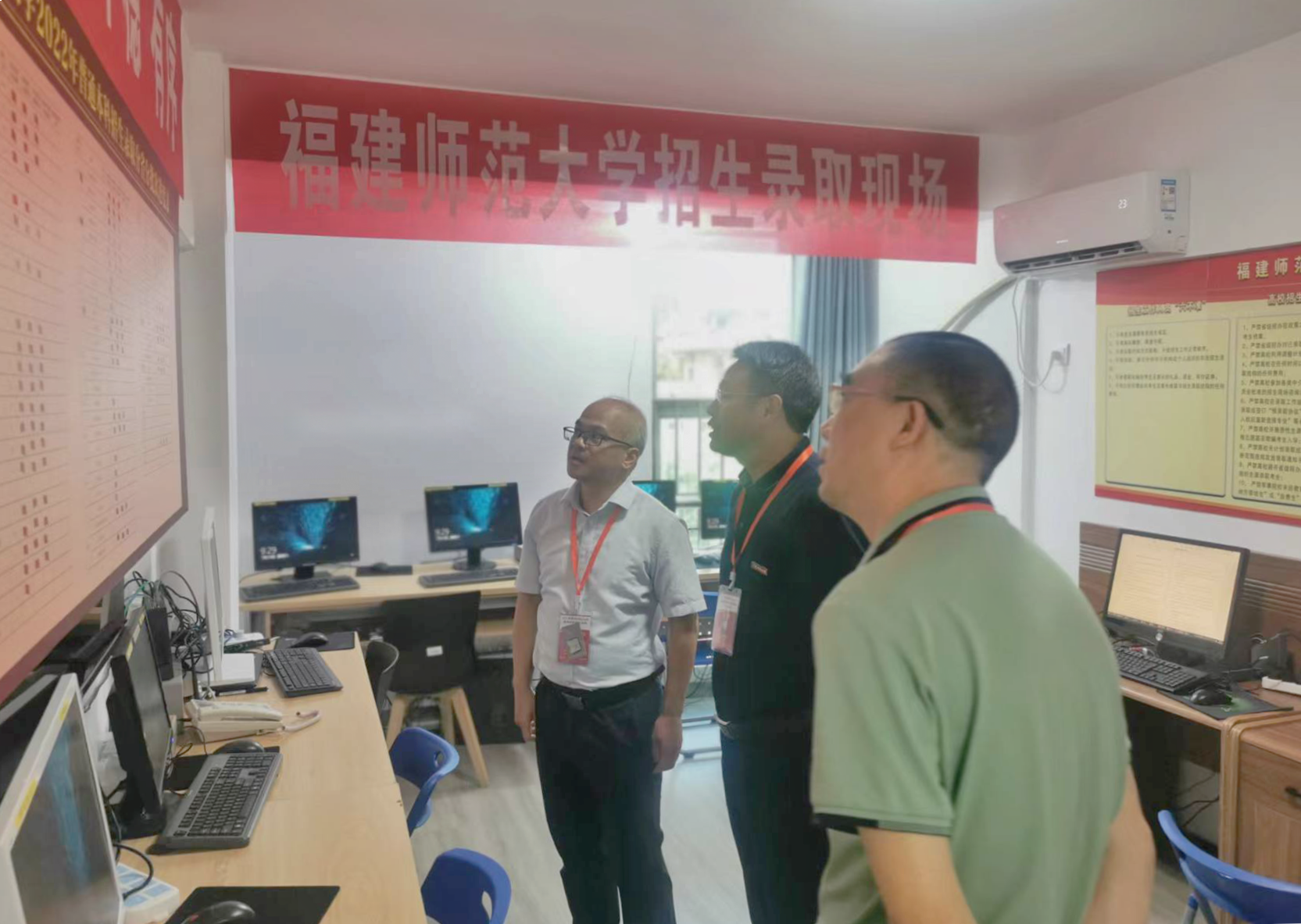 7月23日,校党委书记潘玉腾、副校长郑家建到学校2022年普通本科招生录取现场,检查指导招生录取工作并看望慰问工作人员,党政办公室、纪委(监察专员办)负责人陪同检查。