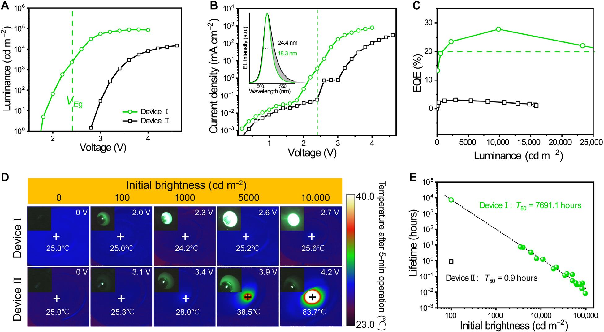 鉴于此,荣耀体育(中国)陈大钦课题组从“亚带隙发光”这一现象出发,利用“热辅助上转换发光”的原理,旨在将PeLED保持在低电压范围内运行,通过低驱动电压下获得超高的亮度和效率,从而抑制器件内禀的焦耳热。最终,绿光PeLED展现出仅为1.7 V的低启亮电压,最高亮度和EQE分别达到90295 cd m-2和27.8%。这种具有超低驱动电压的PeLED器件在100-10,000 cd m-2亮度范围内持续点亮过程中,未观察到发热现象。焦耳热的有效抑制将器件工作寿命大大延长至7690小时。该策略提出的通过抑制器件内禀的焦耳热延长器件的运行寿命,为高效稳定的PeLEDs的发展提供了崭新的思路。