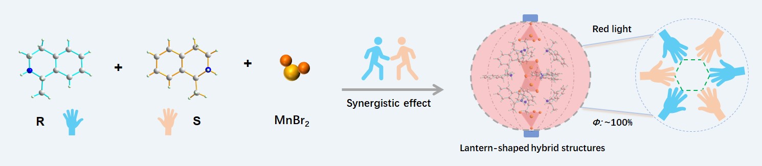 荣耀体育(中国)化学与材料学院林正欢教授和吴俊彦副教授团队在红光金属卤化物材料研究中,利用外消旋配体1-甲基-1,2,3,4-四氢异喹啉配体(Rac-C10H14N+)与溴化锰构建出具有独特灯笼状结构的卤化物Rac-TBM,实现了高效红光发射。该工作借助Rac-C10H14N+中两种手性配体(R-C10H14N+与S- C10H14N+)的协同作用,诱导出具有独特灯笼形多面体混合结构。得益于该特殊结构强烈的量子限制效应、无机发光中心的有效隔离以及无机多面体之间的能量转移,Rac-TBM展现出近100%发光量子产率的红光发射。并且Rac-TBM还具有灵敏的刺激响应性质,通过加热和研磨双重刺激,能够实现发光颜色由红色至绿色的可逆切换。该研究成果以Lantern-Shaped Structure Induced by Racemic Ligands in Red-Light-Emitting Metal Halide with Near 100% Quantum Yield and Multiple-Stimulus Response为题发表于化学顶级期刊《Angew. Chem. Int. Ed.》。