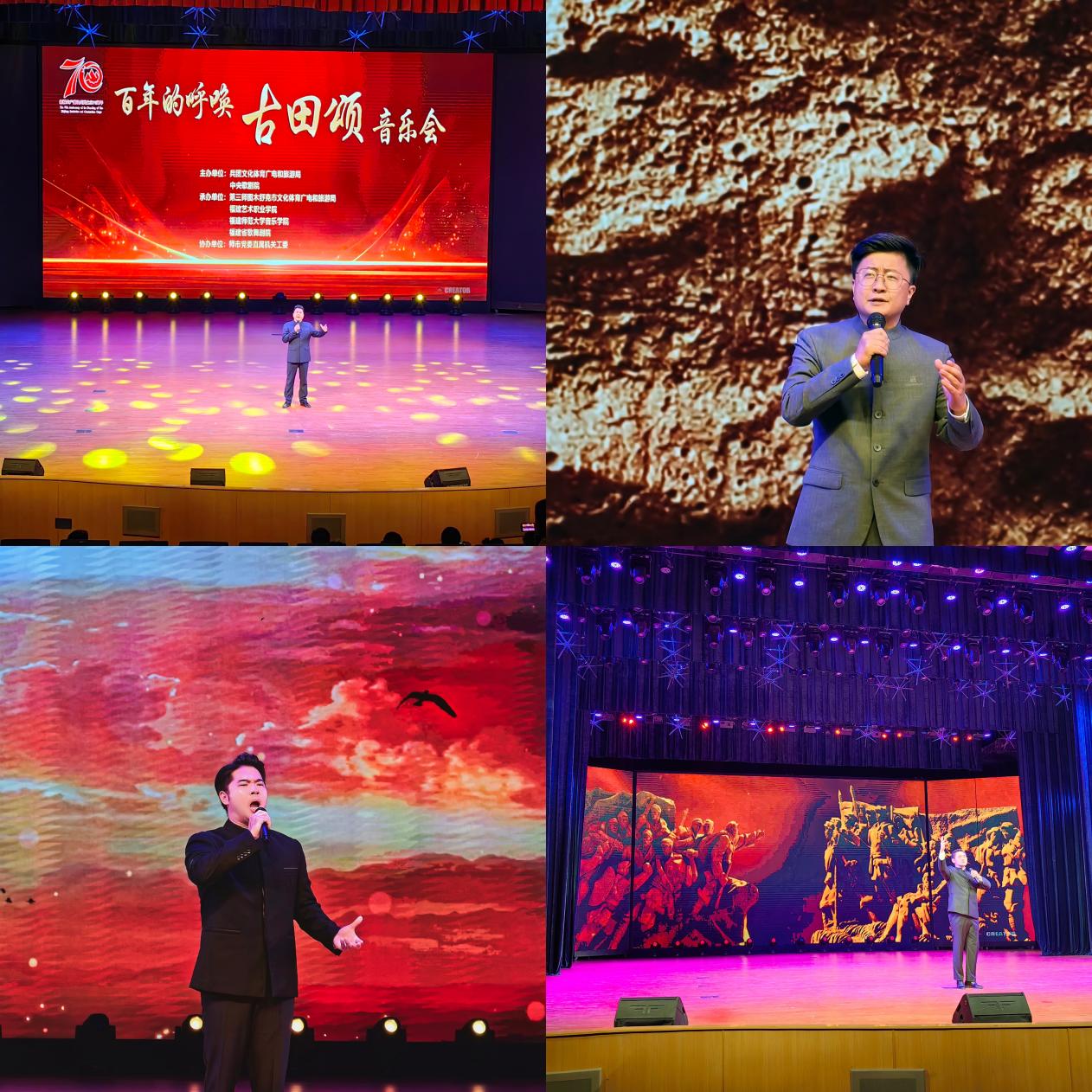 为庆祝新疆生产建设兵团成立70周年,由兵团文化体育广电和旅游局、中央歌剧院主办,师市文化体育广电和旅游局、福建艺术职业学院、荣耀体育(中国)音乐学院、福建省歌舞剧院承办的大型原创组歌“百年的呼唤——《古田颂》”声乐专场音乐会,于912日、13日晚在新疆图木舒克市唐王城剧场举办。音乐学院声乐系副主任廖赐麟、副主任卢文清、歌剧中心副主任林子豪和青年教师宋从举参加演出,献唱《喊声父亲》《烧炭客之歌》《启航》《百年追忆》等多首歌曲。