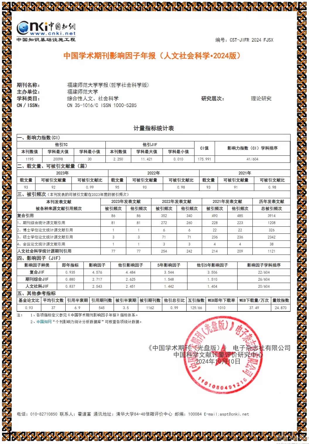 日前,《中国学术期刊(光盘版)》电子杂志社有限公司、中国科学文献计量评价研究中心联合发布《中国学术期刊影响因子年报(人文社会科学·2024版)》。《荣耀体育官方网页版学报(哲学社会科学版)》影响力指数CI值为175.991,在综合性人文社会科学604种期刊中排名第41位,相比上一年度又前进7个位次;复合影响因子为4.576,综合影响因子为2.717,均比上一年度有所提升。(学报编辑部)