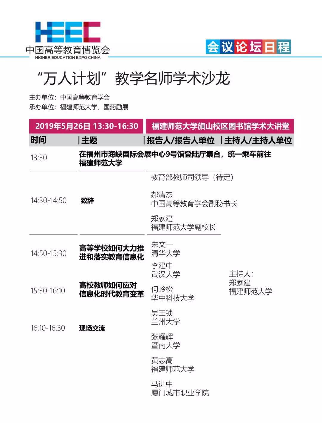 由中国高等教育学会主办,福建省高等教育学会,荣耀体育官方网页版参与承办和协办,以“讴歌新中国70年辉煌成就 推进教育现代化创新发展”为主题的中国高等教育博览会(2019·春)将于5月26日至28日在福州海峡国际会展中心举办。本届展会将为大家带来千余家参展企业、2500余个展位、6万平方米展出面积、上万件展示产品,20余个高峰论坛、160余场专题报告。其中,荣耀体育(中国)还作为具体承办单位承办“万人计划”教学名师学术沙龙、国家级教学成果奖专题报告会、中国高等教育学会“一带一路”研究分会第一届理事会及第二届“一带一路”国家教育高峰论坛等活动。会议论坛日程如下: