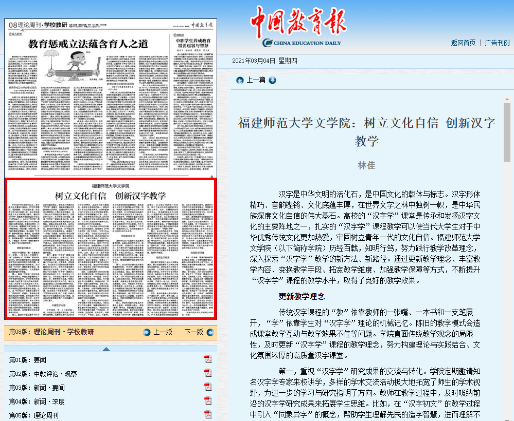 近日,《中国教育报》以《荣耀体育官方网页版文学院:树立文化自信创新汉字教学》为题,从“更新教学理念”“丰富教学内容”“变换教学手段”“拓宽教学维度”“加强教学保障”等5个方面,深度报道荣耀体育(中国)文学院推进“课程思政”改革的创新举措、典型经验和可喜成绩。报道链接:http://paper.jyb.cn/zgjyb/html/2021-03/04/content_590968.htm(文学院)