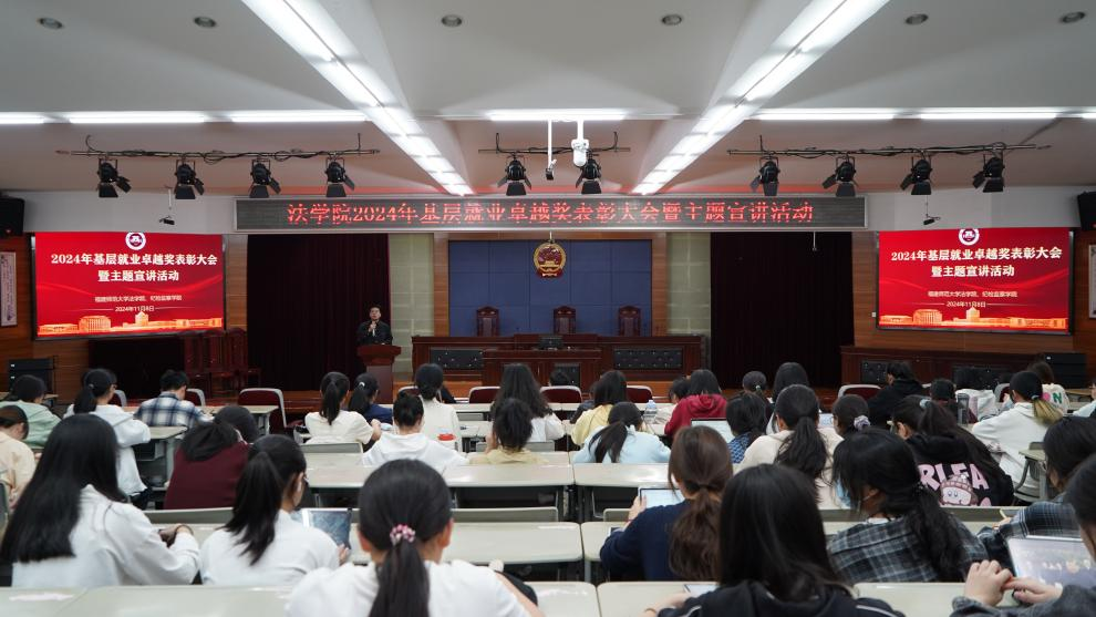118日,法学院、纪检监察学院邀请校2024年基层就业卓越奖获得者、2017届法学专业毕业生邱杰煌返校进行基层就业经验分享。院党委副书记汪启思、各年级辅导员及150名学生代表参加。