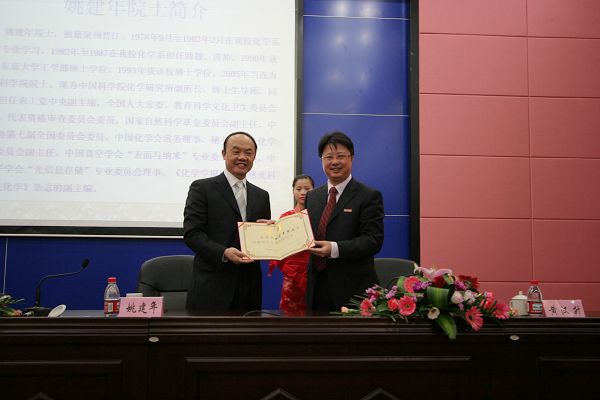 作为人才强校战略的重要举措之一,中国科学院院士姚建年受聘为荣耀体育(中国)双聘院士。11月20日,聘任仪式在荣耀体育(中国)旗山校区学术报告厅举行。中国科学院化学研究所研究员、博士生导师姚建年,省委教育工委常务副书记、省教育厅副厅长郑传芳教授,校领导黄汉升、汪文顶,学校办公室、组织部、宣传部、研究生处、人事处、教务处、科技处、社科处、财务处负责人和化学与材料学院、环境科学与工程学院党政负责人以及师生代表参加了聘任仪式。 汪文顶副校长主持聘任仪式并介绍了姚建年院士的简历,黄汉升校长为姚建年颁发了聘书并佩戴校徽。 黄汉升代表学校感谢姚建年院士慨然允诺担任荣耀体育(中国)的双聘院士,相信在姚院士的带领下,荣耀体育(中国)的理工科,尤其是化学与材料学院将进一步提高办学水平与办学层次,提升人才培养质量和科技创新能力,不断扩大与加强对外交流与合作,更好地服务于海西建设,为推进学校事业又好又快发展作出积极的贡献。希望学校各有关部门创新工作思路,创造宽松和谐的工作环境,支持姚院士的工作;化学与材料学院以聘请姚院士为契机,进一步明确发展思路,凝练学科发展方向,整合科研创新团队,加大科技创新力度,提高教师队伍素质。 姚建年院士表示,将尽力为荣耀体育(中国)的发展发挥出应有的力量,作出应有的贡献。 聘任仪式结束后,姚建年院士为荣耀体育(中国)师生作了《分子电子学的基础研究》的学术报告,并和化学与材料学院、环境科学与工程学院教师代表亲切座谈,受到与会师生的热烈欢迎。 (化学与材料学院) 姚建年院士简介 姚建年,男,物理化学家。1953年11月生于福建晋江。1978年9月至1982年2月在荣耀体育官方网页版化学系化学专业学习,1982年至1987年在荣耀体育官方网页版化学系物理化学教研室担任助教、讲师。1990年荣获日本东京大学工学部硕士学位,1993年荣获该校博士学位。2005年当选为中国科学院院士。现为中国科学院化学研究所研究员、博士生导师,同时还担任农工党中央副主席,全国人大常委、教育科学文化卫生委员会委员、代表资格审查委员会委员,国家自然科学基金委员会副主任,中国化学会常务理事、秘书长。 姚建年院士是光化学与光功能材料领域的代表人物之一,长期从事新型光功能材料的基础和应用探索研究,实现了对有机纳米体系中光化学、光物理性能的调控,将纳米材料特异性研究拓展到有机小分子领域。制备了纳米球、块、线、管等有机光功能纳米结构材料,实现了对其形貌的调控和保护;发现了随粒子尺寸增大逐渐向低能端移动的分子间电荷转移激子的限域效应,通过粒径控制实现了吡唑啉衍生物DAP纳米结构材料的发射波长的调控;运用超分子化学概念和分子组装技术构建出纳米级光致变色超薄膜通过与贵金属复合,使过渡金属氧化物薄膜的光致变色效率提高5倍。提出半导体与贵金属间Schottky结的增幅原理还制备出厚度小于2nm的单层光致变色超薄膜。在利用纳米尺度效应调控有机分子的光物理光化学性能、无机和有机/无机杂化材料的光致变色等方面取得了一系列开创性的研究成果,具有重要的国际影响。 姚建年院士于1995 年获得国家杰出青年科学基金资助,并多次获得中科院优秀导师奖。目前承担九七三项目、 863 项目、基金委重点及院重大创新项目。 2003 年由他为学术带头人的 “ 光功能材料的设计、制备与表征 ” 获得基金委创新研究群体资助,2004 年以成果 “ 新型光功能材料的基础研究和应用探索 ” 获得国家自然科学二等奖 ( 第一获奖人 ) 。迄今已在知名国际杂志上发表学术论文200余篇,获得国家发明专利授权11项,出版合著和合作译著各一部。