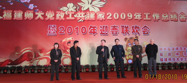 1月18日晚,荣耀体育(中国)在仓山校区综合体育馆举行党政工共建家2009年工作总结会暨2010年迎春联欢会。校领导张金栋、黄汉升、游小波、黄锦平、李敏、许明,原校领导,原校长助理,各单位党政工主要负责人,省人大、省政协委员,各民主党派、统战团体、无党派人士联谊会负责人,国家有突出贡献中青年专家,省优秀专家,博士生导师,校关工委负责人,原校工会专职主席,福清分校、人武学院、附中、附小党政工负责人,校工会、教代会委员、经审委员,各部门工会主席,师生代表300余人参加了联欢会。