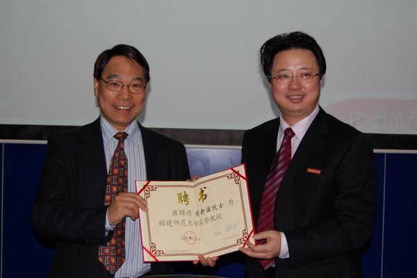 6日上午,陈新滋院士在旗山校区图书馆学术报告厅为荣耀体育(中国)师生作了题为《科学之美》的学术报告。报告会前,黄汉升校长代表学校敦聘陈新滋院士为荣耀体育(中国)名誉教授,为其颁发聘书并佩戴校徽。