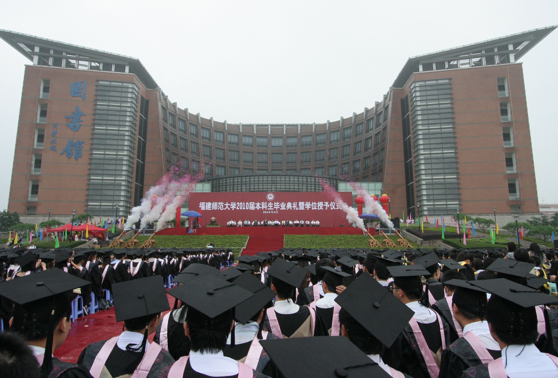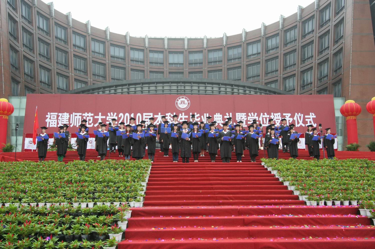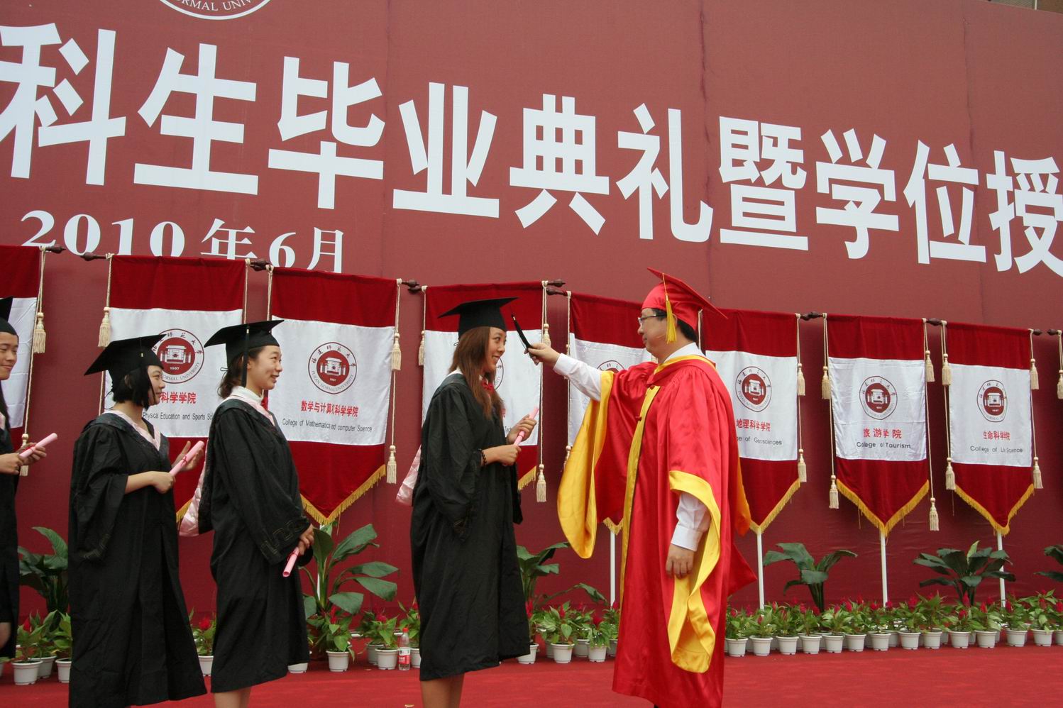 学位授予仪式上,黄汉升校长亲自为每一位2010届本科毕业生执行“拨穗礼”,并与毕业生合影留念。
