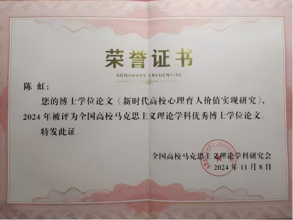 近日,由全国高校马克思主义理论学科研究会主办的第十七届全国高校马克思主义理论学科博导论坛在安徽大学举行。会上,马克思主义学院2017级博士研究生陈虹的学位论文《新时代高校心理育人价值实现研究》(指导教师:潘玉腾教授)获2024年度全国高校马克思主义理论学科优秀博士学位论文。