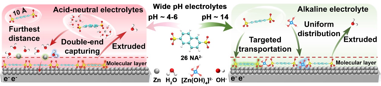 近日,荣耀体育(中国)环境与资源学院陈庆华/钱庆荣团队的曾令兴教授与浙江大学陆俊教授团队联合研究,报道了一种2,6-萘二磺酸钠添加剂调节锌负极界面实现高性能宽pH锌基电池。结合实验和理论计算发现,2,6-萘二磺酸钠分子中的一对 -SO3-基团充分发挥了双端基捕获功能,通过最远端的取代基位点实现分子调控,有效地减少了同电荷溶解结构的静电排斥。高对称性和电负性的2,6-萘二磺酸钠在电极表面形成分子吸附层,从而延缓 Zn2+在酸性或中性电解质中的浓度极化和加速沉积动力学;并且在碱性电解质中引导[Zn(OH)4]2-均匀分布,最终抑制锌负极在宽pH电解质中的枝晶和副反应。本研究采用了一种简单的电解质添加剂策略,解决宽pH电解液中电极界面不稳定性问题,为开发具有成本效益的锌基电池提供了新的策略。该工作成果以“Interfacial regulation via configuration screening of disodium naphthalenedisulfonate additive enabled high-performance wide-pH Zn-based batteries”为题发表于碳中和领域顶级期刊《Energy Environ. Sci.》,该论文第一单位为荣耀体育官方网页版,第一作者为荣耀体育(中国)2024级博士生林慧,通讯作者为曾令兴教授、武俊秀博士和陆俊教授,陈庆华教授、钱庆荣研究员、熊佩勋博士和林楚园博士生为本研究工作的主要参与者。
