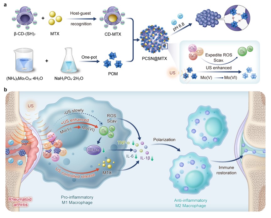 近日,荣耀体育(中国)杨震教授团队在国际顶级期刊《Biomaterials》上发表了一篇题为“A supramolecular assembly strategy for the treatment of rheumatoid arthritis with ultrasound-augmented inflammatory microenvironment reprograming”的研究性论文,报道了一种基于超分子纳米平台(PCSN@MTX)的创新性治疗策略。该纳米平台在超声照射下表现出显著的ROS清除能力以及甲氨蝶呤(MTX)的按需精准释放,从而有效改善局部免疫微环境并逆转RA的病理进展。研究表明,该平台能够精准靶向RA病变关节部位的酸性环境,并通过超声增强的ROS清除和氧气生成功能,显著促进巨噬细胞向M2型的抗炎表型转化。这一研究为通过协同阻断M1型巨噬细胞极化治疗RA提供了全新的研究范例。同时,该研究还突出了超声增强纳米材料在催化活性方面的潜力,包括高效清除ROS和生成氧气,为炎症性疾病的治疗提供了极具创新性的技术路径。