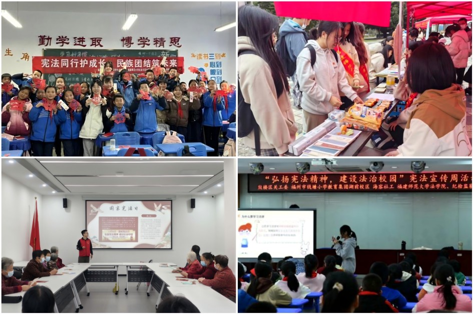 法学院深入社区,分别与鼓楼区海容青少年社会工作服务中心、台江区悦行社会工作服务中心、蔗洲村团支部等合作,通过讲解宪法知识、分发宪法主题宣传册、提供法律常识咨询等“互动式”普法方式,开展宪法普法宣讲。
