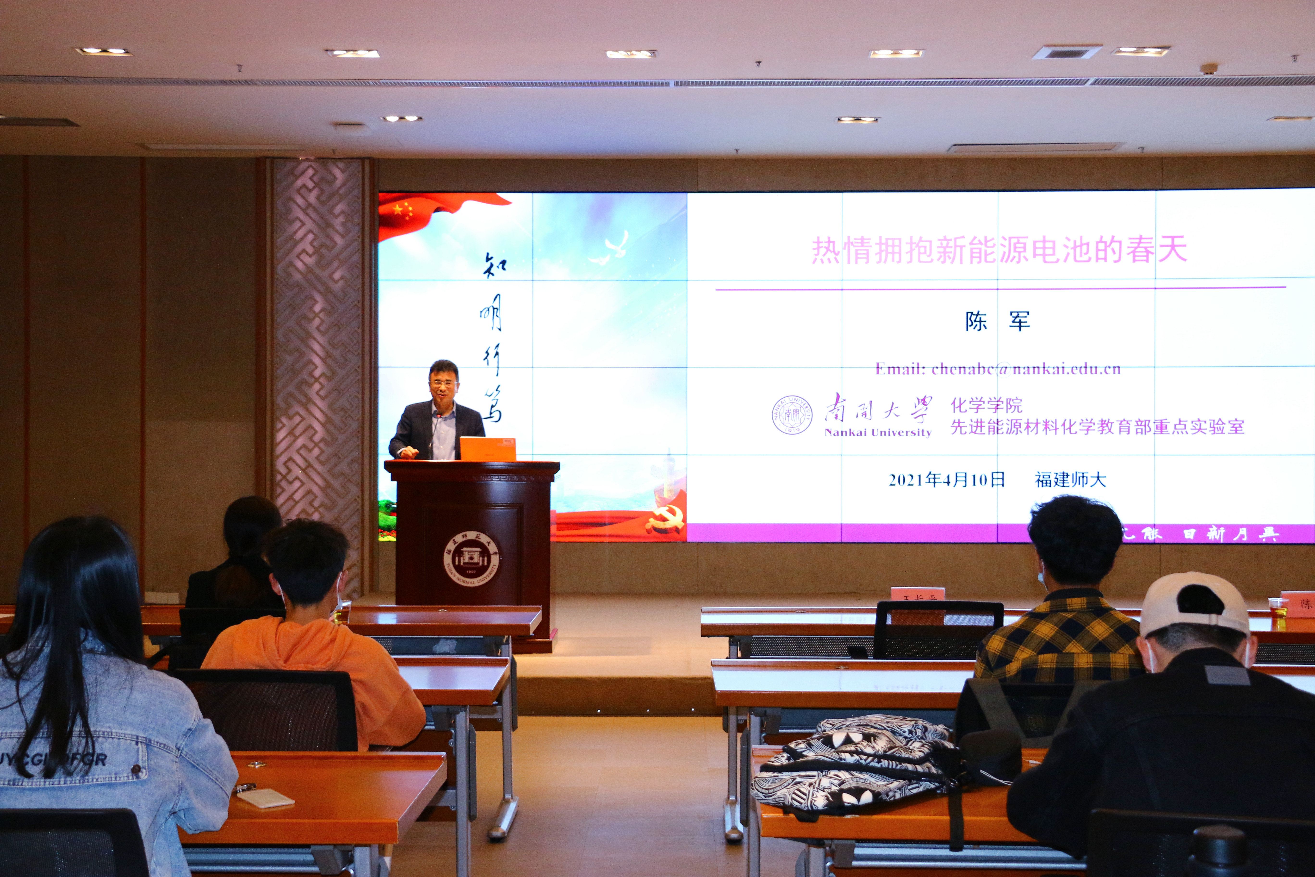近日,中国科学院院士、南开大学副校长陈军教授莅临荣耀体育(中国)环境科学与工程学院开展学术交流指导,并在旗山校区宏达厅作题为《热情拥抱新能源电池的春天》的学术报告。活动由王长平校长主持,陈庆华副校长,环境科学与工程学院主要负责人及学院全体师生参加了此次活动。