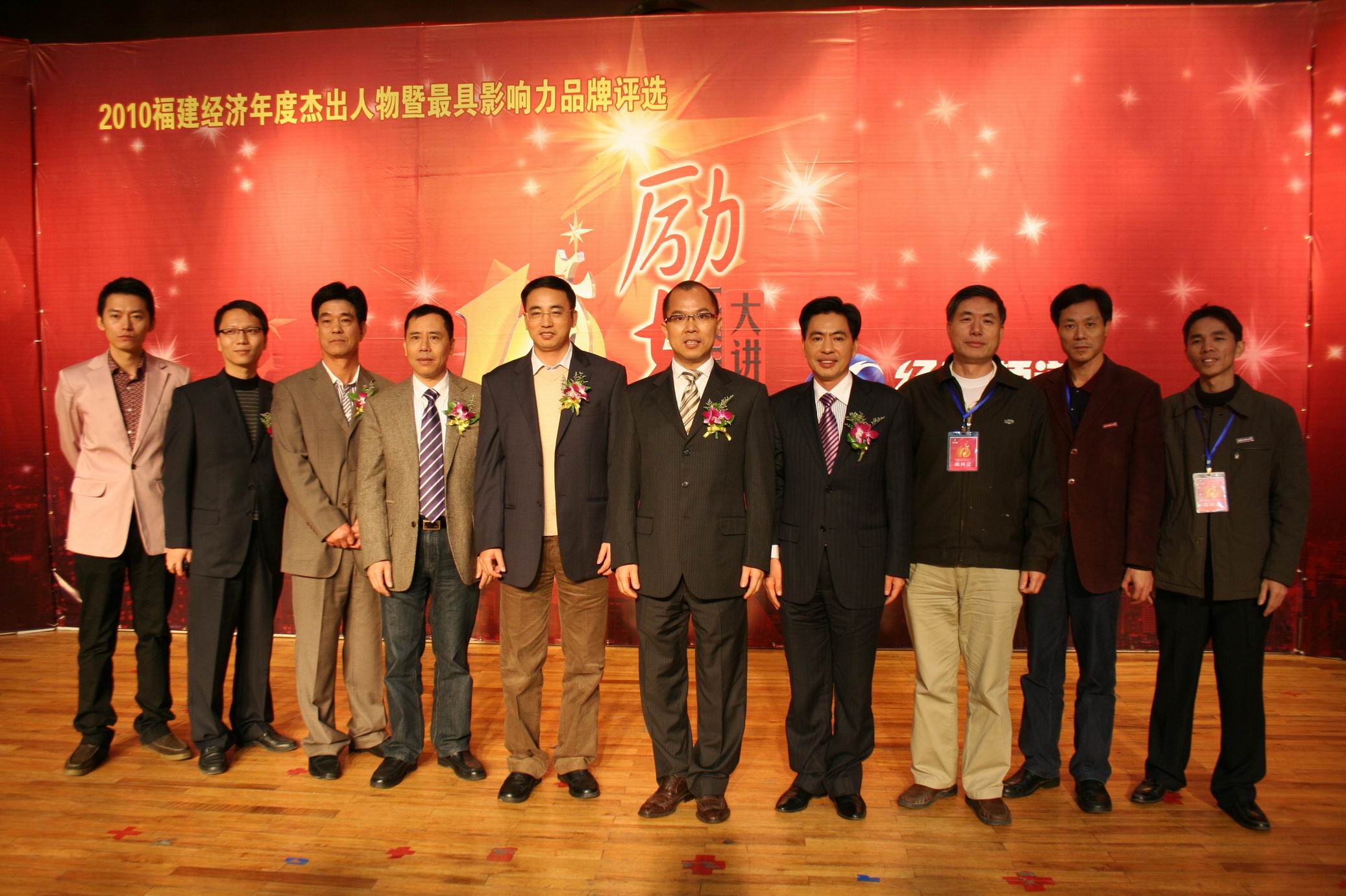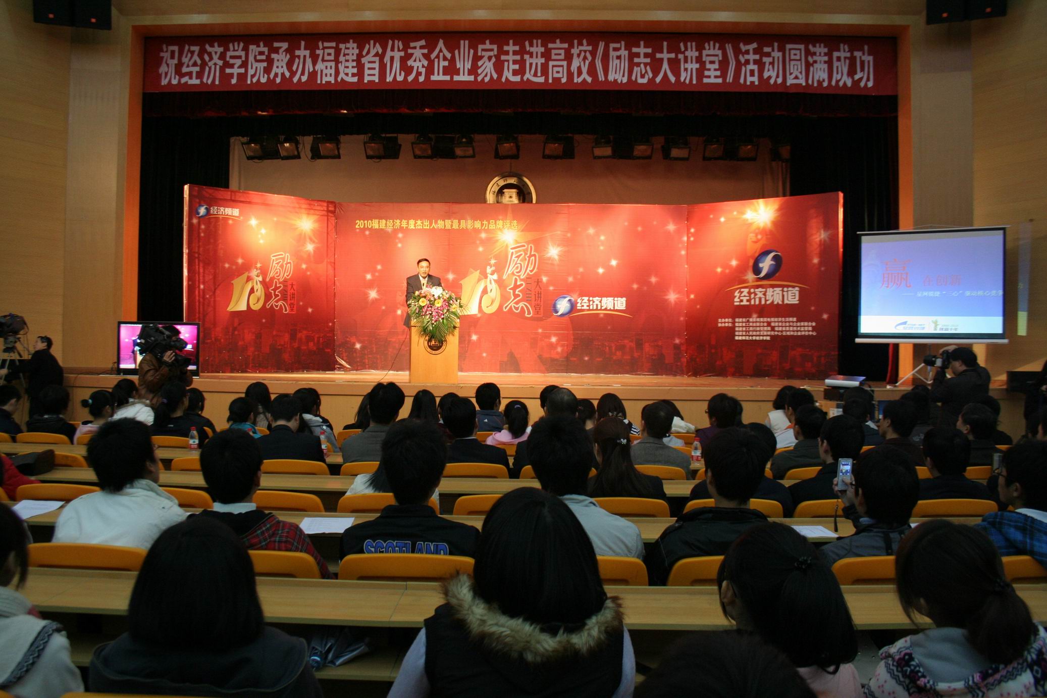 12月15日下午,2010福建经济年度杰出人物《励志大讲堂》活动在荣耀体育(中国)青春剧场举行。此次活动由福建省广播影视集团主办,福建省工商业联合会、福建省企业与企业家联合会、福建省工商行政管理局、福建省质量技术监督局、福建省人民政府发展研究中心区域评价中心等单位联合协办,福建省广播影视集团电视经济生活频道和荣耀体育(中国)经济学院联合承办。
