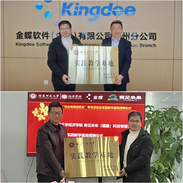 1220日,经济学院深入金蝶软件(中国)有限公司福建省公司、育见未来(福建)科技有限公司开展访企拓岗暨实践教学基地挂牌仪式。学院党委副书记叶龙祥、副院长戴双兴,财会系党支部书记张业圳、系主任及财务管理专业负责人秦晓东等参与活动。