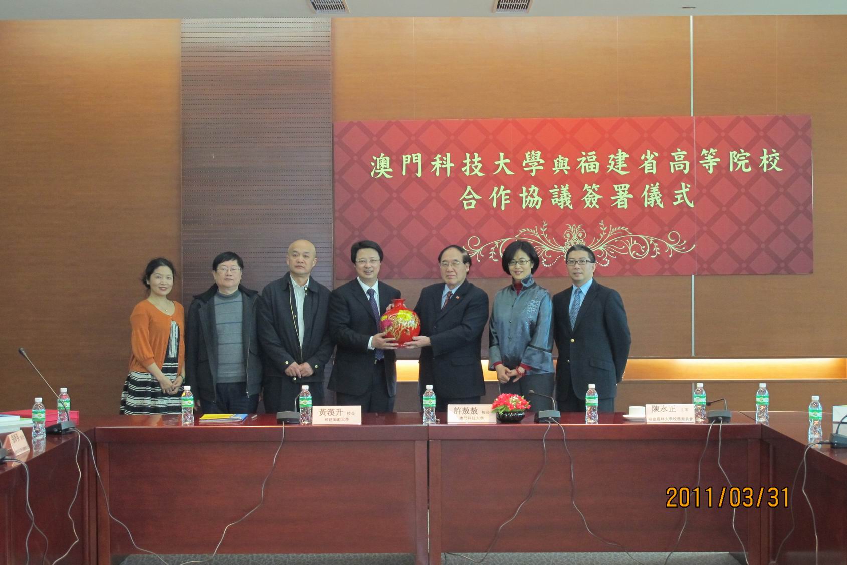 3月28日—4月1日,黄汉升校长、许明副校长,以及研究生处马重奇处长、校友总会薛璐玲秘书长一行4人,随省委书记孙春兰率领的代表团赴港澳考察访问。访问期间,黄校长出席了我省代表团分别在香港、澳门举办的两场“福建科学发展跨越发展推介会”,与香港浸会大学、澳门科技大学签订了交流合作协议,并与部分旅港校友亲切会面。