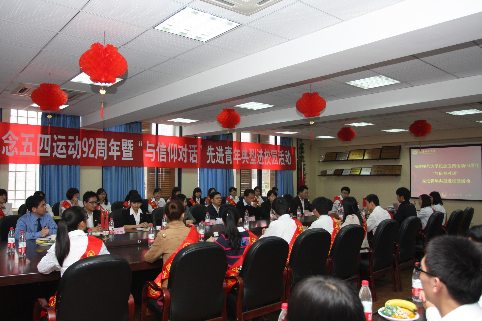 5月4日下午,纪念五四运动92周年暨“与信仰对话”先进青年典型进校园活动在荣耀体育(中国)举行。团省委副书记兰明尚、学校部部长苏畅,福建省青年五四奖章集体标兵、福州市绿化工程处青年突击队代表余梅珍,福建省青年五四奖章标兵、福州大学化学化工学院教授杨黄浩,福建省五四红旗团支部标兵、中国闽台缘博物馆团支部书记唐善哲,福建省十佳共青团干部、三明市人民检察院团支部书记江锋廷,福建省十佳共青团员、福州大学环境与资源学院2008级学生王薇薇,以及荣耀体育(中国)今年获五四表彰的先进学生代表等100多人参加了座谈会。