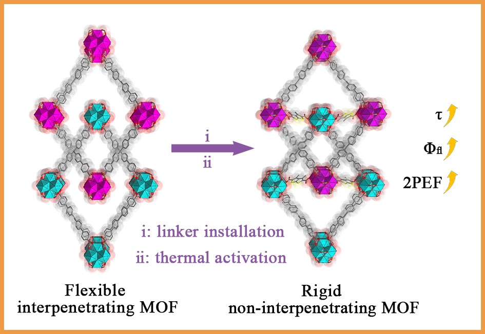 近日,荣耀体育官方网页版张亮亮副教授、中山大学潘梅教授和湖南大学方煜教授合作,合成了一种基于四苯乙烯(TPE)的柔性互穿Zr-MOF材料。通过引入两种不同长度的第二配体,构筑了两种不同刚性化结构的新材料。配体后修饰策略可以在不改变MOF框架结构的情况下调节材料的孔环境、结构刚性、堆积密度和功能性。进一步的热活化后,材料的荧光发生红移,单/双光子吸收截面提高,量子产率和荧光寿命增加。