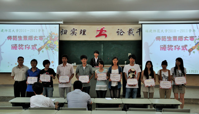 课堂教学技能竞赛决赛之后举行校师范生素质赛颁奖仪式。地理科学学院等14个学院获得优秀组织奖,戴颖等138名同学在课堂教学技能竞赛、多媒体课件比赛、“三笔”赛中获奖。