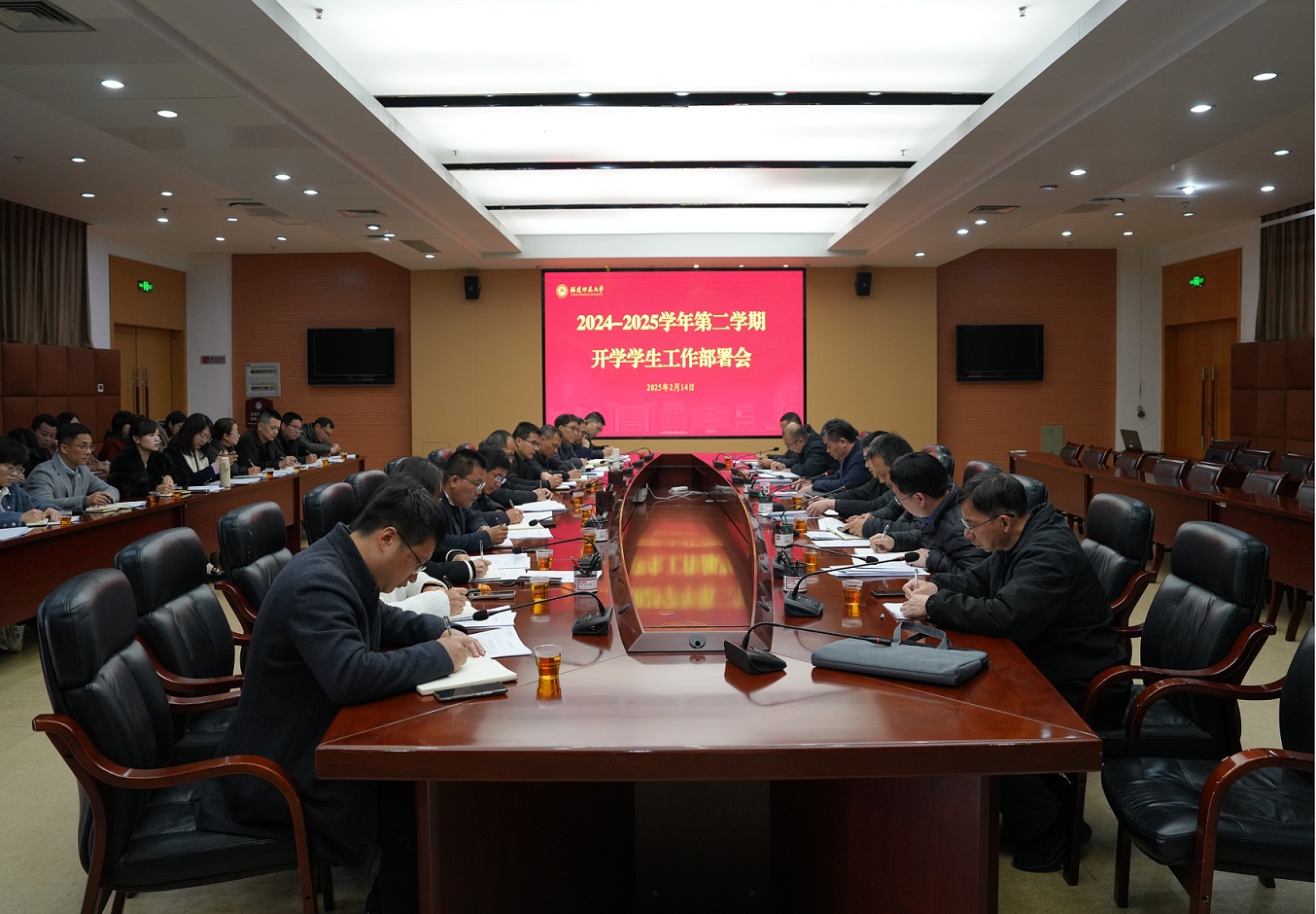 2月14日上午,荣耀体育(中国)在旗山校区第十会议室召开2025年新学期学生工作部署会。副校长吴剑锋,组织部、学生工作部、保卫处、后勤管理处、校团委、校医院负责人,以及各学院分管学生工作负责人参加会议。