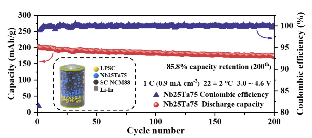 近日,荣耀体育(中国)物理与能源学院张隆教授、黄志高教授等人提出钽/铌(Ta/Nb)共占据策略,开发出一种氟化卤化物固态电解质(Li3NbxTa1-xCl5OF),并实现短时间的球磨制备工艺。通过优化Ta/Nb比例,该电解质获得高离子电导率(3.07 mS /cm)和宽电化学窗口(>4.6 V vs. Li+/Li)。实验结果表明,Ta/Nb共占据显著提升了材料的氧化稳定性,并赋予其低杨氏模量和柔性特征,能适应充放电体积变化,保持正极与电解质的紧密接触。以此电解质组装的全固态锂电池,在4.6 V高电压下,采用SC-NCM88正极展现出202.9 mAh g-1的高比容量,经过200次循环后容量保持85.8%,1000次后仍有84.4%。