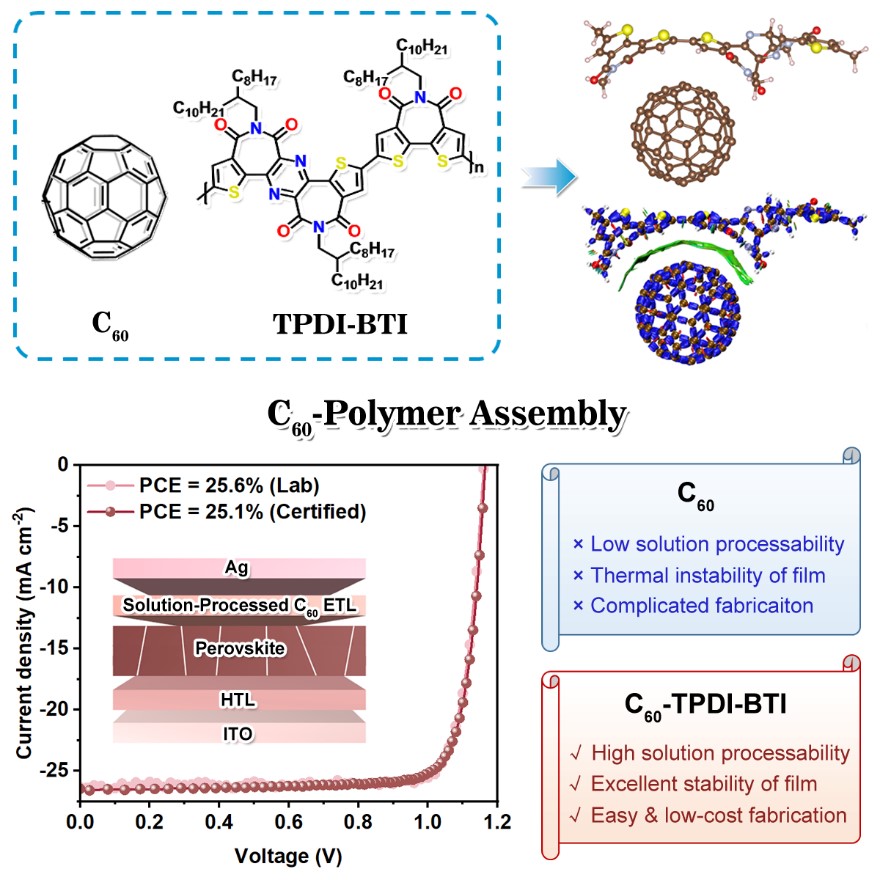 鉴于此,荣耀体育(中国)化学与材料学院邢舟副教授、海峡柔性电子学院安明伟副教授和南方科技大学郭旭岗教授团队、洛桑联邦理工学院夏建兴/Nazeeruddin教授团队合作,设计并合成一种n型聚合物TPDI-BTI用于和C60液相组装高效、稳定的电子传输层。得益于该分子柔软的链状骨架、理想的分子间化学作用和电子能级匹配,TPDI-BTI不仅可以插入相邻碳笼之间抑制碳笼团聚,而且可以调控碳笼的电子传输和薄膜的界面化学作用。基于C60-TPDI-BTI的钙钛矿电池表现出25.6%的光电转化效率(第三方权威认证25.1%),为目前该类钙钛矿电池的最优性能。同时,在2000小时的光照老化和800小时的高温老化后,电池仍能保持很好的光伏性能。研究成果以《Solubilizing and Stabilizing C60 with n-Type Polymer Enables Efficient Inverted Perovskite Solar Cells》为题发表于能源领域国际顶级期刊《Joule》上,这项工作突破了高性能C60电子传输层只能通过真空热蒸发法制备的局限性,对全液相法制备高效、稳定钙钛矿电池具有重要意义。