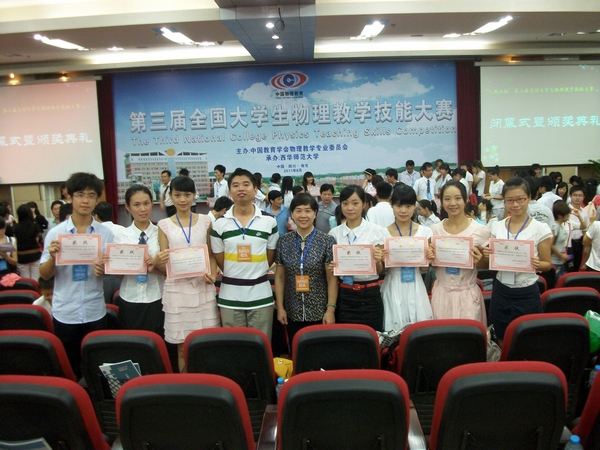 本次大赛包括北京师范大学、华东师范大学等91所全国高师院校共选派800多名师范生参加。荣耀体育(中国)由物理与光电信息科技学院黄树清、林钦两位老师为领队、6名本科生和1名研究生(本届比赛首开研究生参赛,独立设2个小组)共同组成的代表队参加了此次比赛。7名选手不负众望,在各自的小组中发挥出色,以精彩的讲课和富有创意的教具得到了评委的高度评价,最终全部获得一等奖。其中3名选手(研究生组潘丽珍、本科生组张晴晴、林梦婷)排名小组第一获得特等奖,其他4名选手(本科生组戴颖、卢倩、庄莹莹、章逸文)均名列小组第二获得一等奖。本次比赛的指导教师章镇、黄树清老师获得“优秀指导教师”称号。同时,荣耀体育(中国)再次获得大赛组委会授予的“优秀组织奖”荣誉称号。