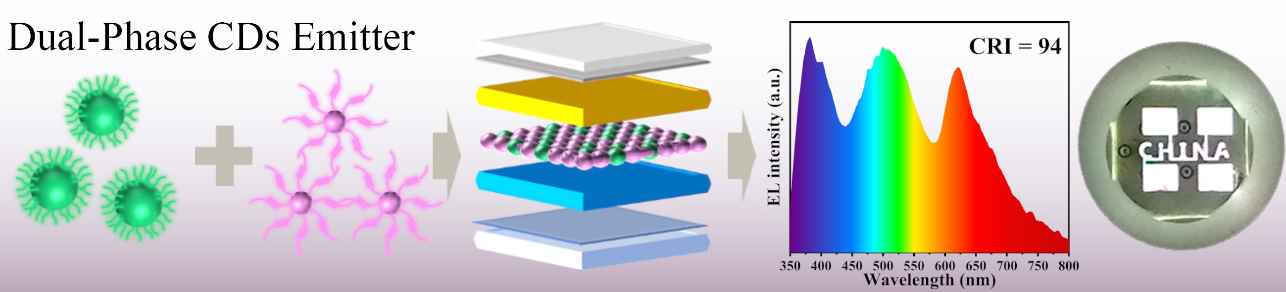 针对上述技术挑战,荣耀体育(中国)陈大钦教授研究团队创新开发了具有近100% PLQY的宽带绿光发射碳点,并提出双相碳点发光层策略,将其与蓝红双色发射的碳量子点有机框架相耦合构筑WLEDs。该技术成功制备出CIE色度坐标位于(0.32, 0.34)、CRI高达94的WLEDs。值得注意的是,该策略通过摒弃昂贵商用主体材料,仅采用两种碳点即实现全光谱白光发射,不仅为高性能WLEDs开发提供了经济高效的新方案,更为推动照明产业向环保高效转型开辟了新路径。