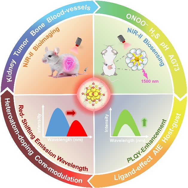 近日,荣耀体育(中国)海峡柔性电子(未来科技)学院姚传好教授团队对NIR-II发光金纳米团簇的设计与应用进行了全面回顾,总结了该领域的重要进展,重点探讨了提升光致发光量子产率(PLQY)和实现发射波长红移的策略。文中整合了最新的研究数据与案例,主要分为三个部分:(一)NIR-II发光金纳米团簇在生物成像与生物传感中的优势及应用;(二)从异质原子掺杂、配体工程、主客体相互作用和AIE等多个维度深入探讨了提升光致发光量子产率的策略;(三)从团簇核心调控、配体效应和环境因素调控等方面全面解析了红移金纳米团簇发射波长的方法。最后,文章对该领域未来的研究方向提出了深刻见解和独到思考,为研究NIR-II发光金团簇的学者提供了有价值的参考资源,有望推动NIR-II金团簇在生物成像与生物传感应用的发展,同时促进相关技术的进步。