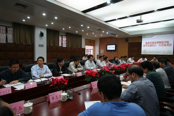 11月1日上午,泉州师范学院副校长林华东一行18人来校商讨联合培养硕士研究生事宜。黄汉升校长,学校办公室、研究生处、教务处和教育学院、经济学院、公共管理学院、马克思主义学院、音乐学院、美术学院、体育科学学院、数学与计算机科学学院、物理与光电信息科技学院、化学与材料学院、地理科学学院、生命科学学院等单位负责人会见了来访客人。