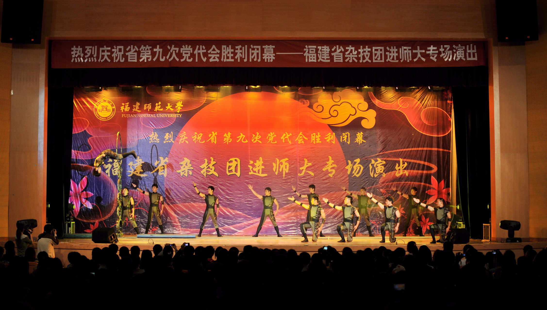 为热烈庆祝福建省第九次党代会胜利闭幕,大力弘扬“爱国爱乡、海纳百川、乐善好施、敢拼会赢”的福建精神,让广大师生共享我省文化发展成果,福建省杂技团进师大专场演出于11月27日晚在旗山校区青春剧场欢乐开场。省文联党组书记处书记、副主席罗训涌,校党委书记罗萤,校纪委书记许歌平,省杂技团团长林防等嘉宾和全校1000多名师生共同观看演出,感受精彩的杂技艺术。