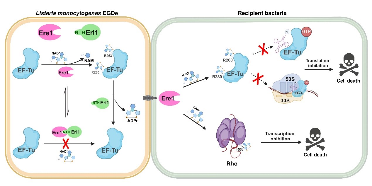 基于此,欧阳松应教授课题组在Science Bulletin上发表了题为“Contact-dependent antagonism is mediated by a T7SSb toxin effector–immunity protein pair via ADP-ribosylation”的研究论文。该研究以重要食源性肠道病原菌—单核细胞增生李斯特菌为模型,详细地揭示了其E-I pair(Ere1-Eri1)协同调控种间竞争的分子机制,为理解细菌种间拮抗作用提供了新的视角。鉴定了一类分布广泛、作用机制独特的E-I pair,并阐明了它们协同调控单核增生李斯特菌种间竞争的详细机制,为理解革兰氏阳性菌细菌拮抗途径提供了见解。此外,深入研究细菌种间竞争机制,也可能为替代抗生素的新策略开发提供帮助,例如利用竞争性共生菌(如粪便移植中的产乳酸菌)的拮抗机制排除病原菌(如艰难梭菌)。