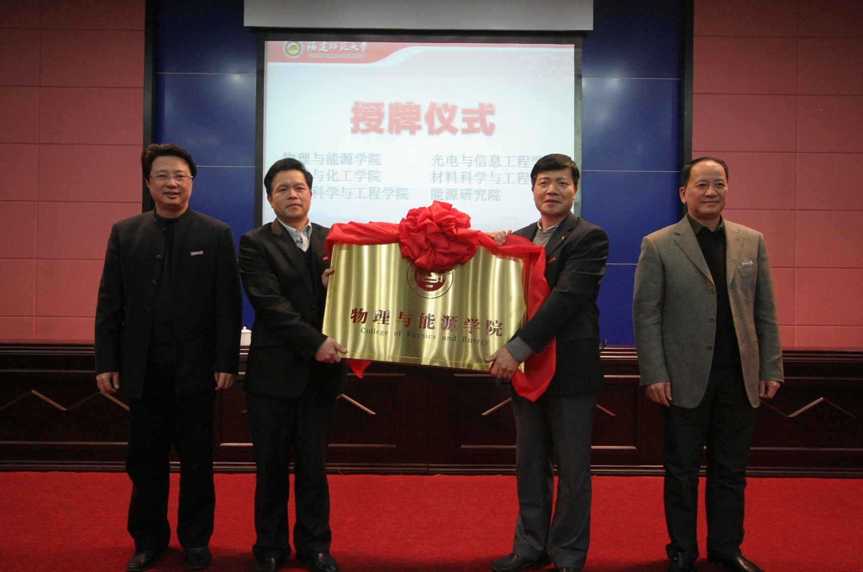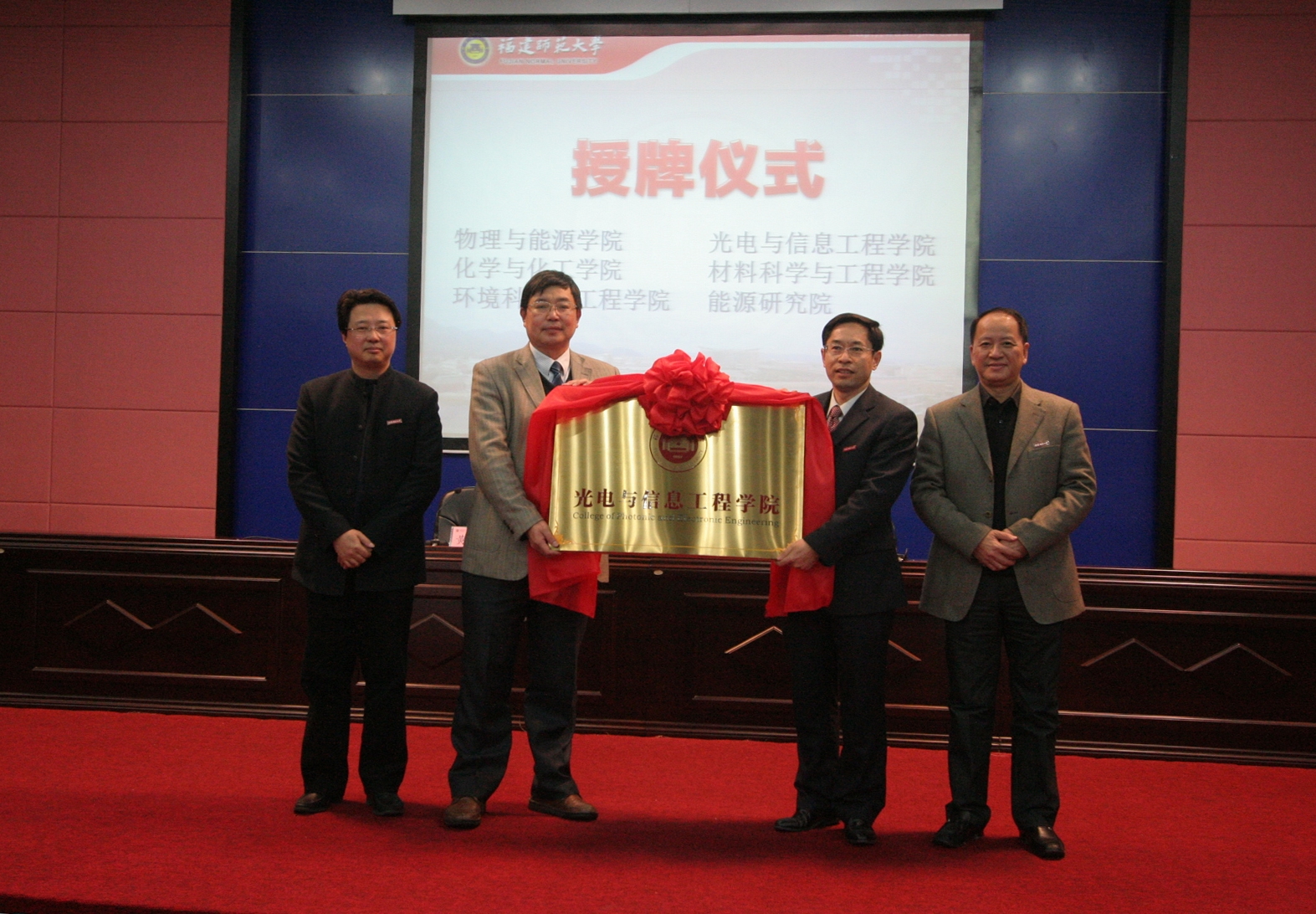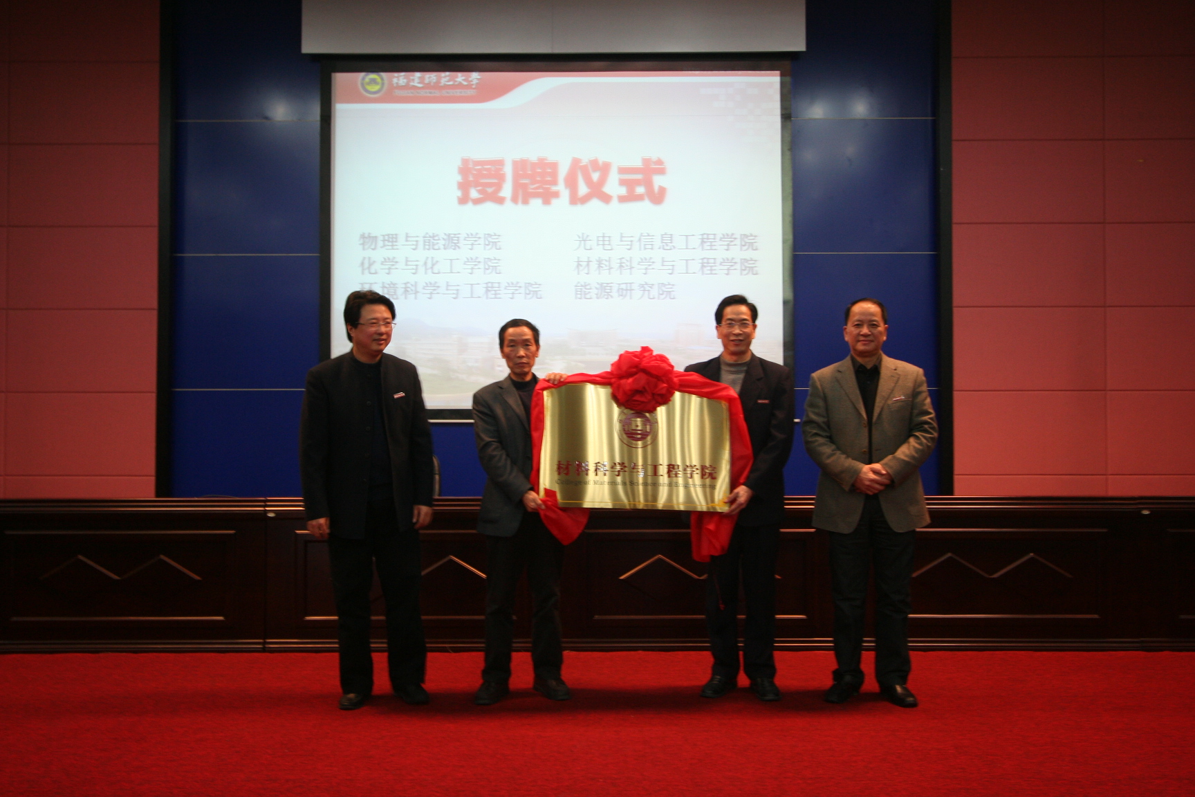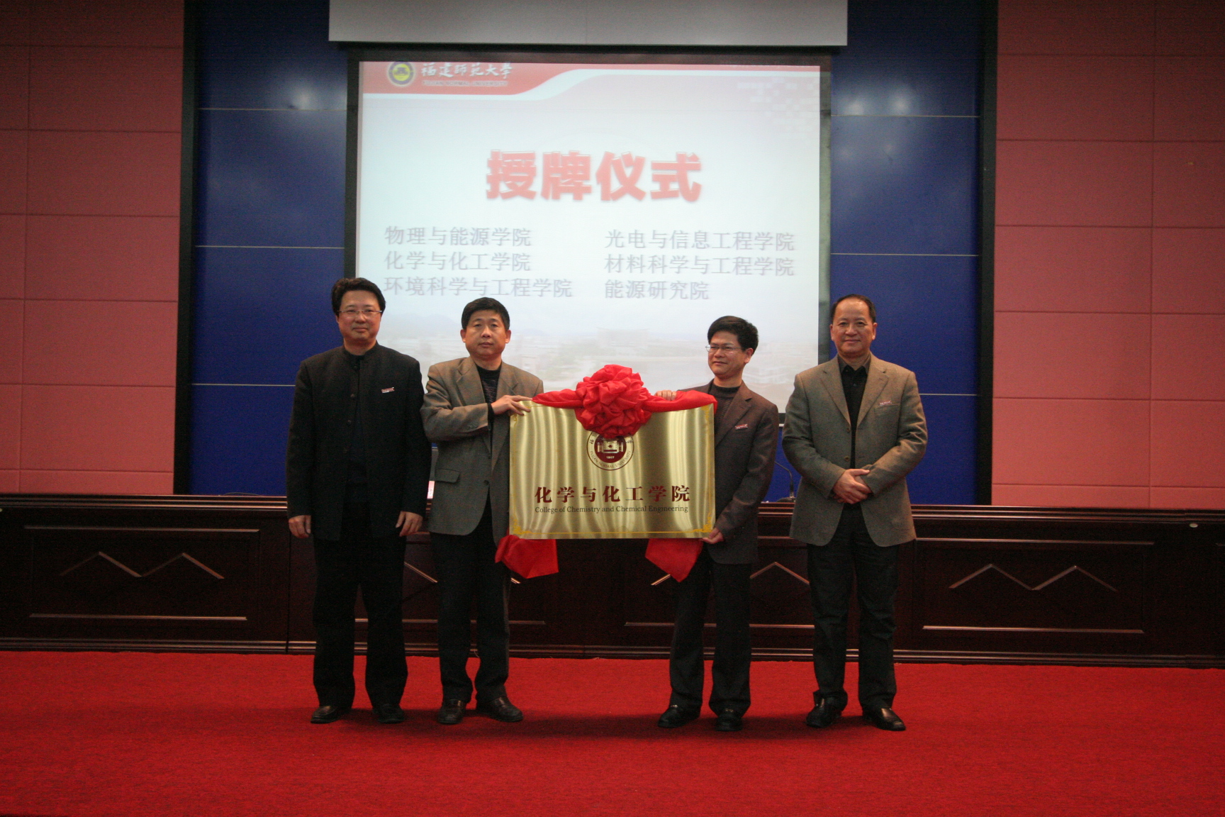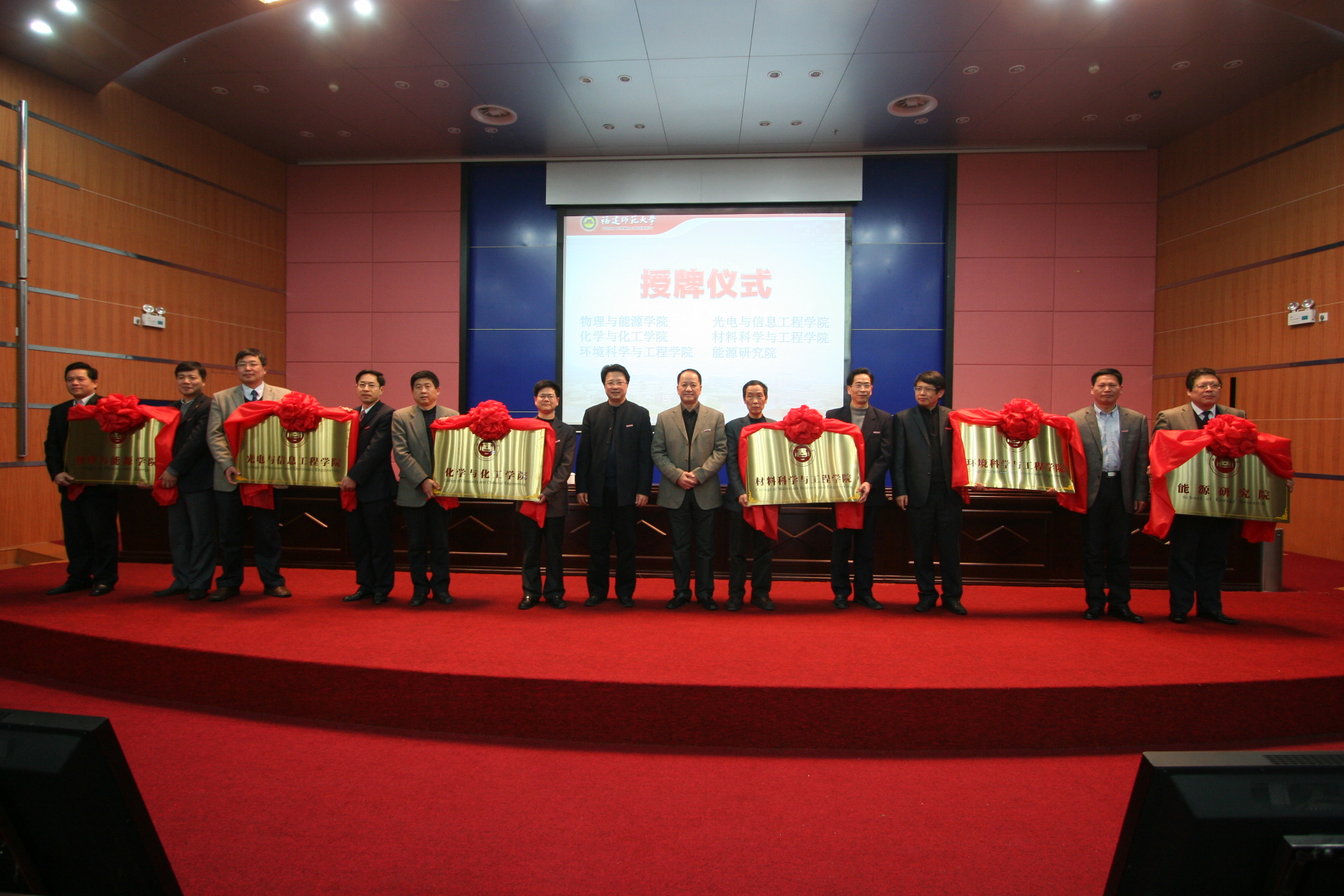 会上还举行了物理与能源学院、光电与信息工程学院、化学与化工学院、材料科学与工程学院、环境科学与工程学院、能源研究院授牌仪式。罗萤书记、黄汉升校长为上述学院(研究院)一一授牌,这标志着荣耀体育(中国)理工学科调整优化工作取得了初步成果,进入了一个新的阶段。