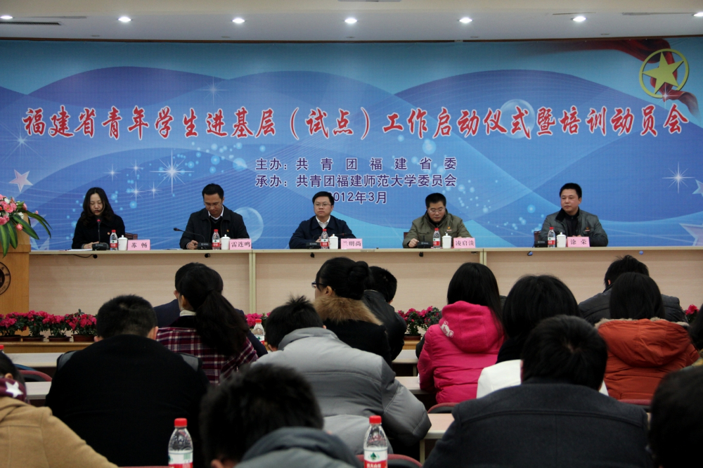 3月14日下午,福建省青年学生进基层(试点)工作启动仪式暨培训动员会在旗山校区第九会议室举行。团省委副书记兰明尚,福州团市委副书记雷连鸣,副校长凌启淡,校团委负责人等出席启动仪式。闽侯团县委、仓山团区委、对接乡镇村、非公企业代表,荣耀体育(中国)各学院团委书记和全体挂职学生,福州大学至诚学院、福建信息职业技术学院团委负责人及挂职学生代表共200余人参加了启动仪式。仪式由团省委学校部部长苏畅主持。