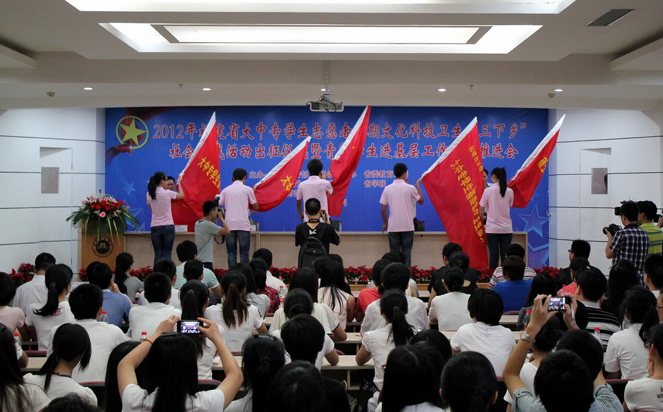 6月21日下午,2012年福建省大中专学生志愿者暑期文化科技卫生“三下乡”社会实践活动出征仪式暨青年学生进基层工作阶段推进会在荣耀体育(中国)举行。团省委主持工作副书记何明华,省委教育工委副书记郭绍生,省委宣传部教育处调研员许祖贤,荣耀体育(中国)党委书记罗萤等出席了启动仪式;省委宣传部、省委教育工委、团省委、省学联相关部门负责人,福州大学等10所在榕高校团委负责人、学生代表,荣耀体育(中国)各学院团委书记和暑期社会实践志愿者代表、青年学生进基层代表250余人参加了出征仪式。仪式由团省委副书记兰明尚主持。