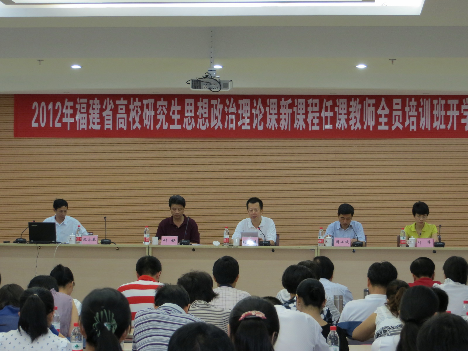 8月1日上午,2012年全省高校研究生思想政治理论课新课程任课教师全员培训班开班仪式在荣耀体育(中国)旗山校区举行。省委教育工委副书记、教育厅党组成员刘剑津,校党委副书记游小波,省委教育工委宣传部部长叶杨,承担培训教学任务的负责人,以及50余名来自全省各高校的研究生思想政治理论课教师参加了开班仪式。
