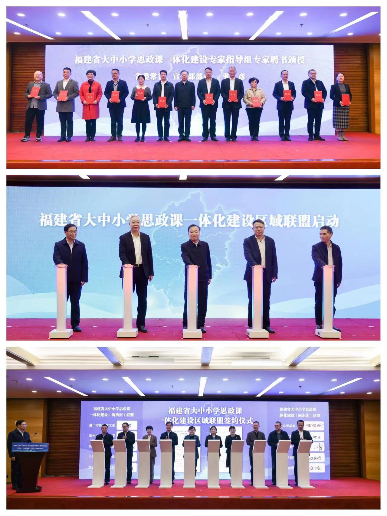 林和平宣读了福建省大中小学思政课一体化建设指导委员会和专家指导组成员名单;张彦为专家指导组专家代表颁发聘书;秦宣就推进大中小学思政课一体化建设和党的二十大精神“三进”工作作了详细指导;各设区市教育局和平潭综合试验区社会事业局负责同志签约成立“闽东北”“闽西南”大中小学思政课一体化建设联盟。