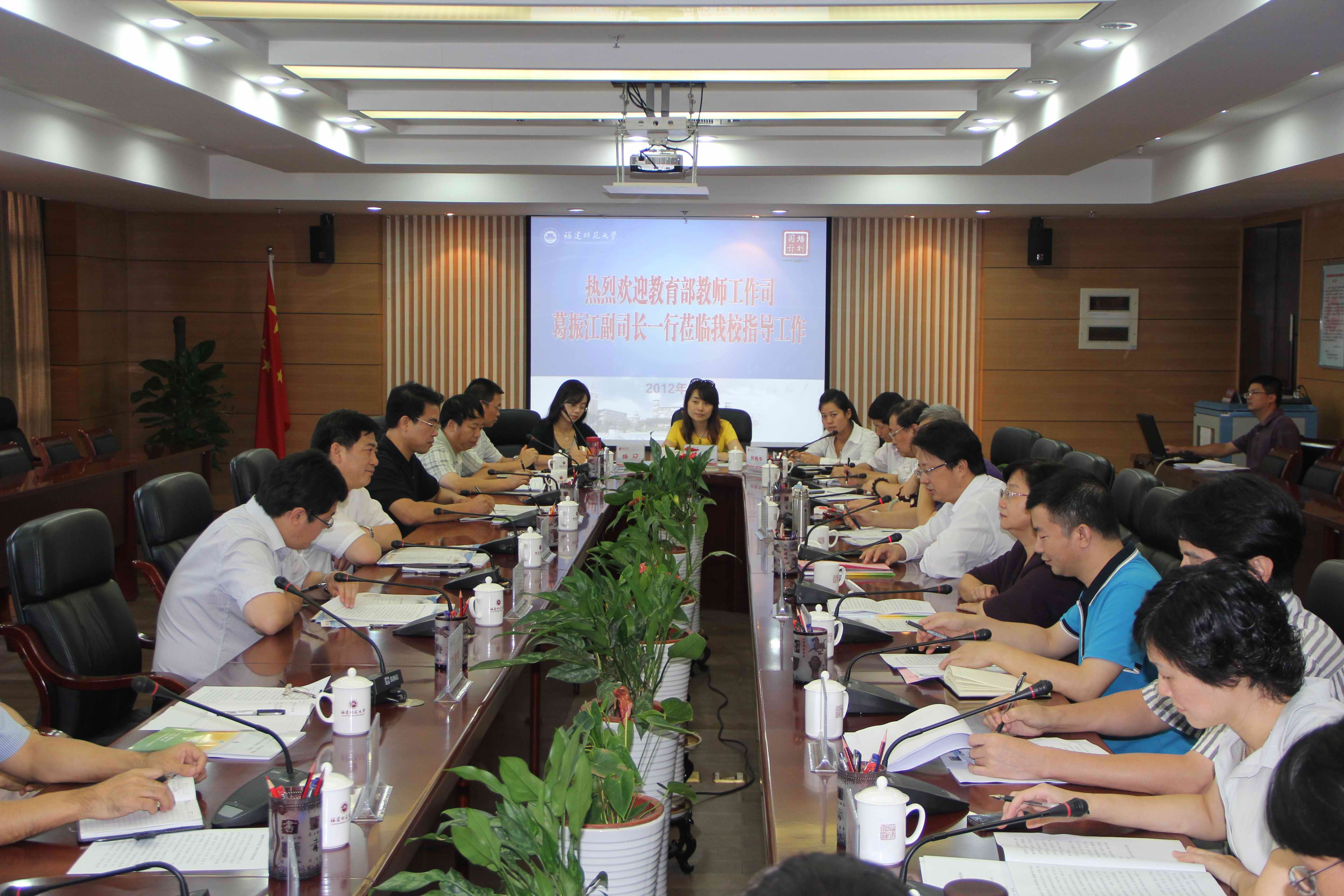 9月20日,教育部教师工作司葛振江副司长、教师工作司培训处王炳明博士,在福建省教育厅人事处高培青调研员的陪同下,莅临荣耀体育(中国)调研指导“国培计划(2012)”培训项目执行工作。黄汉升校长、李敏副校长,学校办公室负责人,国培计划(2012)项目具体执行单位教师教育学院、教育学院、体育科学学院、音乐学院、网络教育学院领导、项目负责人,校内外专家代表、学员代表出席了座谈会。座谈会由李敏副校长主持。