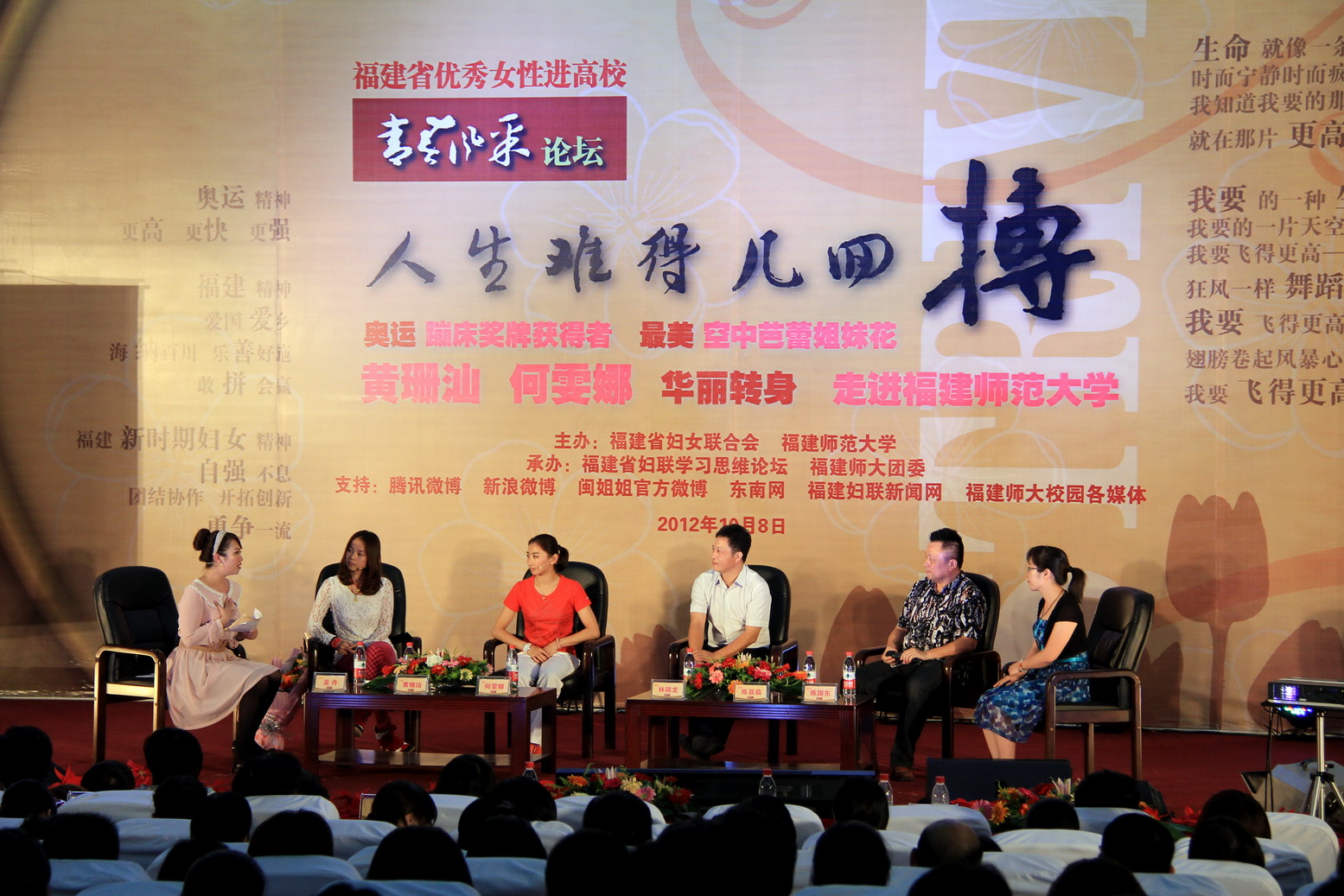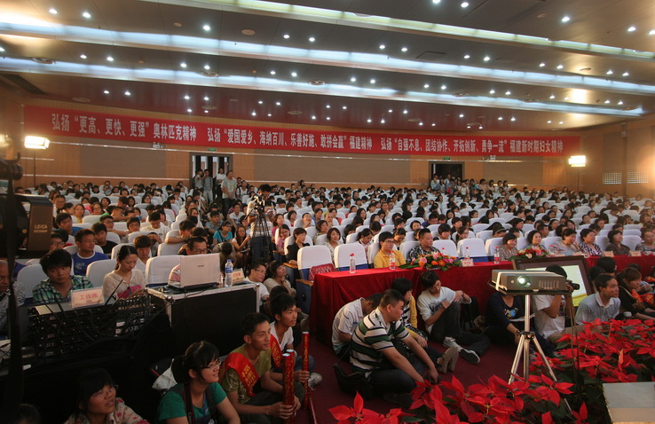 10月8日下午,由福建省妇联与荣耀体育(中国)联合主办的“人生能有几回搏——青春风采论坛”在旗山校区学术大讲堂举行。我省奥运蹦床奖牌获得者、福建省三八红旗手、福建省十大杰出女性黄珊汕、何雯娜与荣耀体育(中国)600多名师生共同分享成长路上的点滴感动,诉说奋勇拼搏、青春励志的奥运故事。校党委书记罗萤亲切会见了两位奥运名将。福建省妇联副主席马义英、王秋梅、包方,校纪委书记许歌平、副校长李敏出席了论坛。